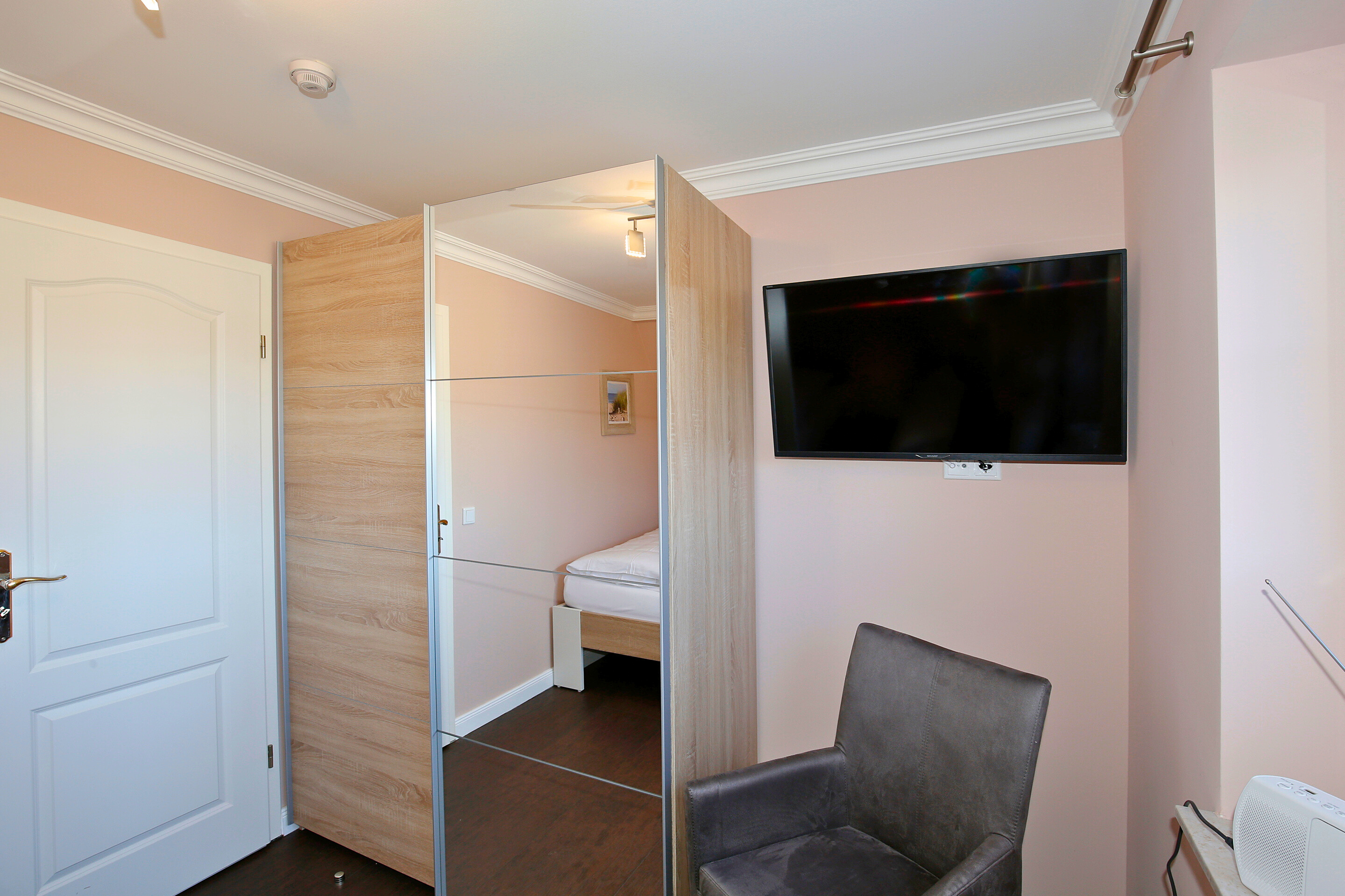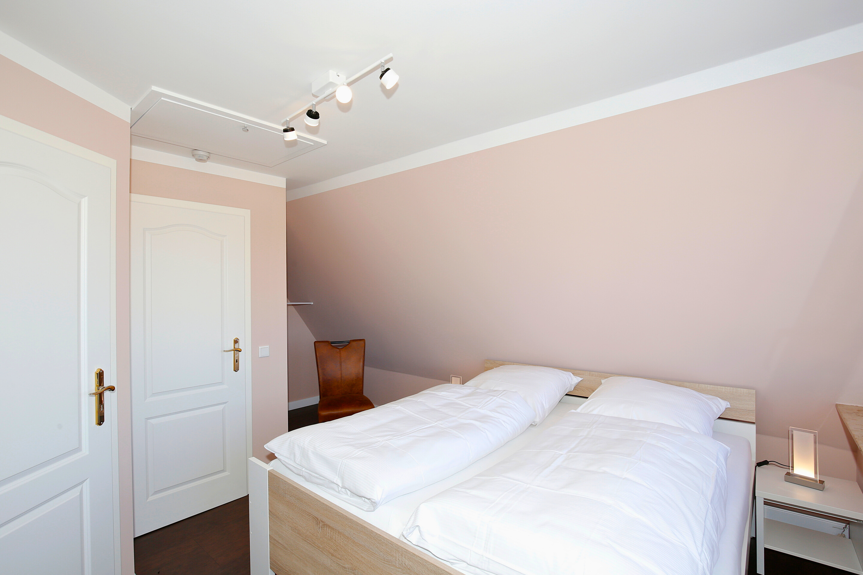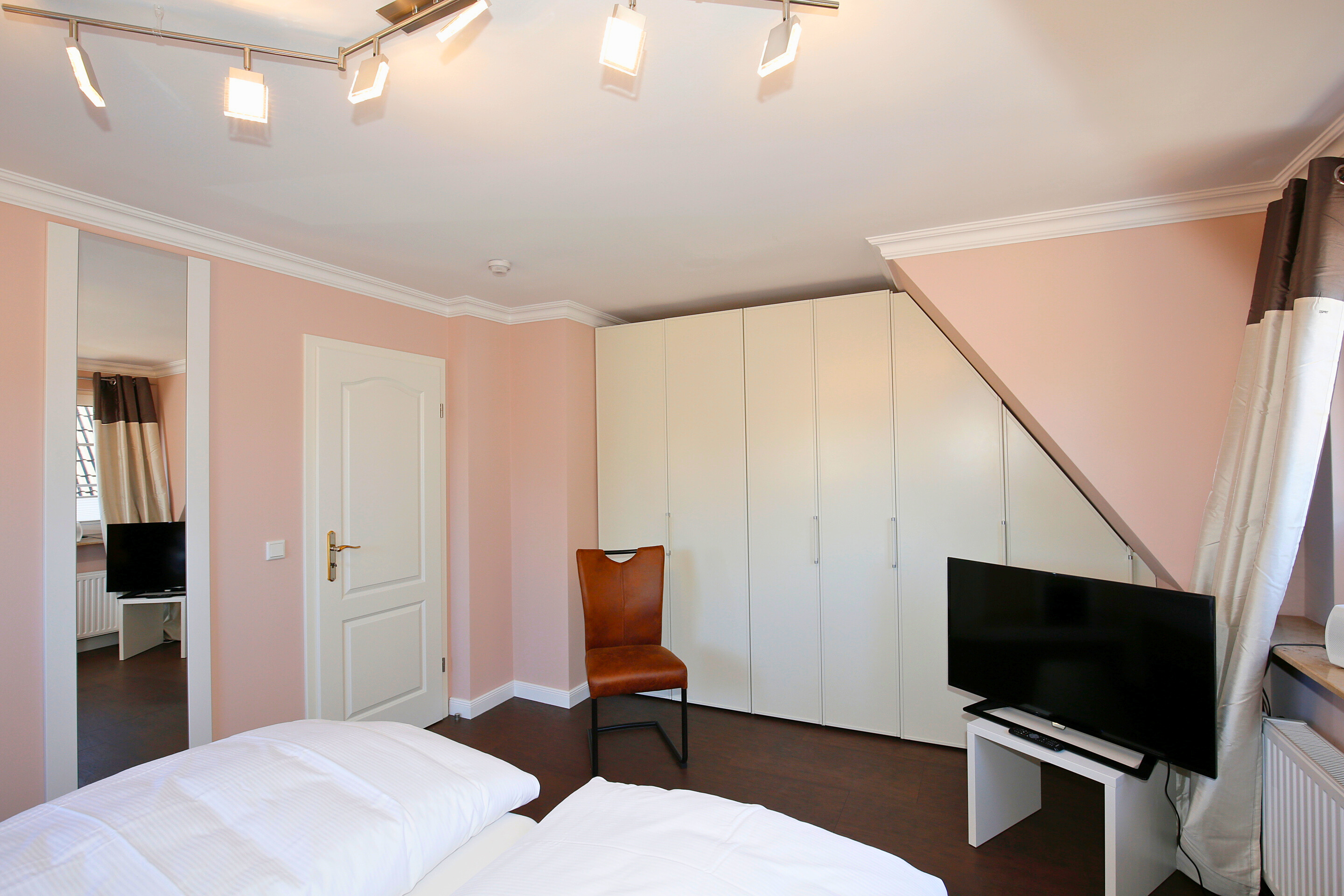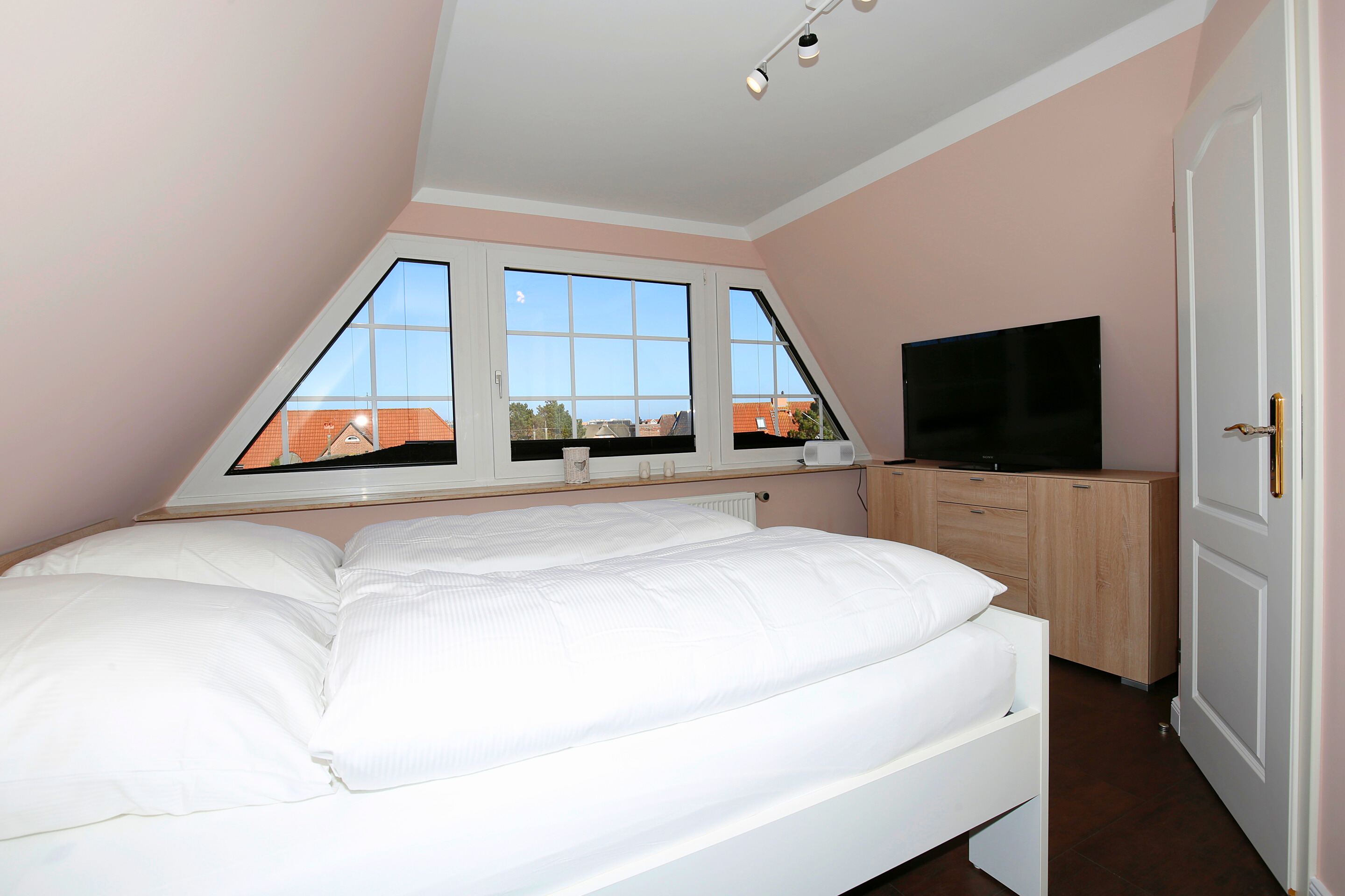 Im Masterbedroom erwartet Sie ein hochwertiges Doppelbett (0,90 x 2,00 m) in Komfortliegehöhe mit eigenem TV. Ein zweites Schlafzimmer bietet zwei Einzelbetten (0,90 x 1,95 m) in Komfortliegehöhe und ebenfalls einen TV. Das moderne Duschbad ist mit einer extraflachen Dusche, einem Waschtisch, einem Fön, einem Handtuchtrockner und einem WC ausgestattet. Ein Panorama-Schlafzimmer, das einen beeindruckenden Blick über die Westerländer Dünenlandschaft bietet, rundet das Raumangebot ab – hier finden Sie ein Doppelbett (0,90 x 1,95 m) in Komfortliegehöhe, einen TV sowie ein eigenes En-suite-Badezimmer.