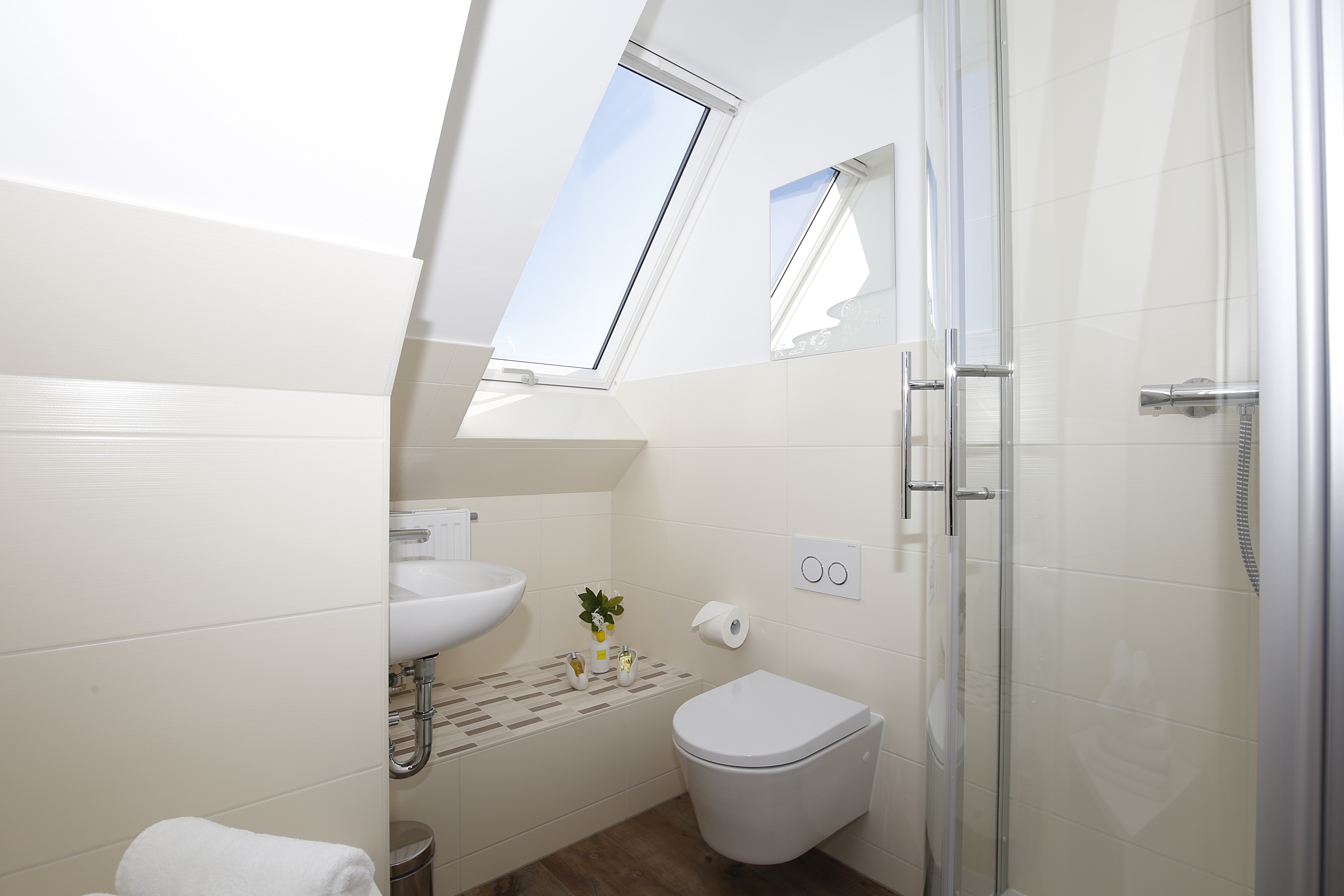 - Beide Bäder mit extraflachen Duschen, Waschtisch, Fön, Handtuchtrockner und WC
