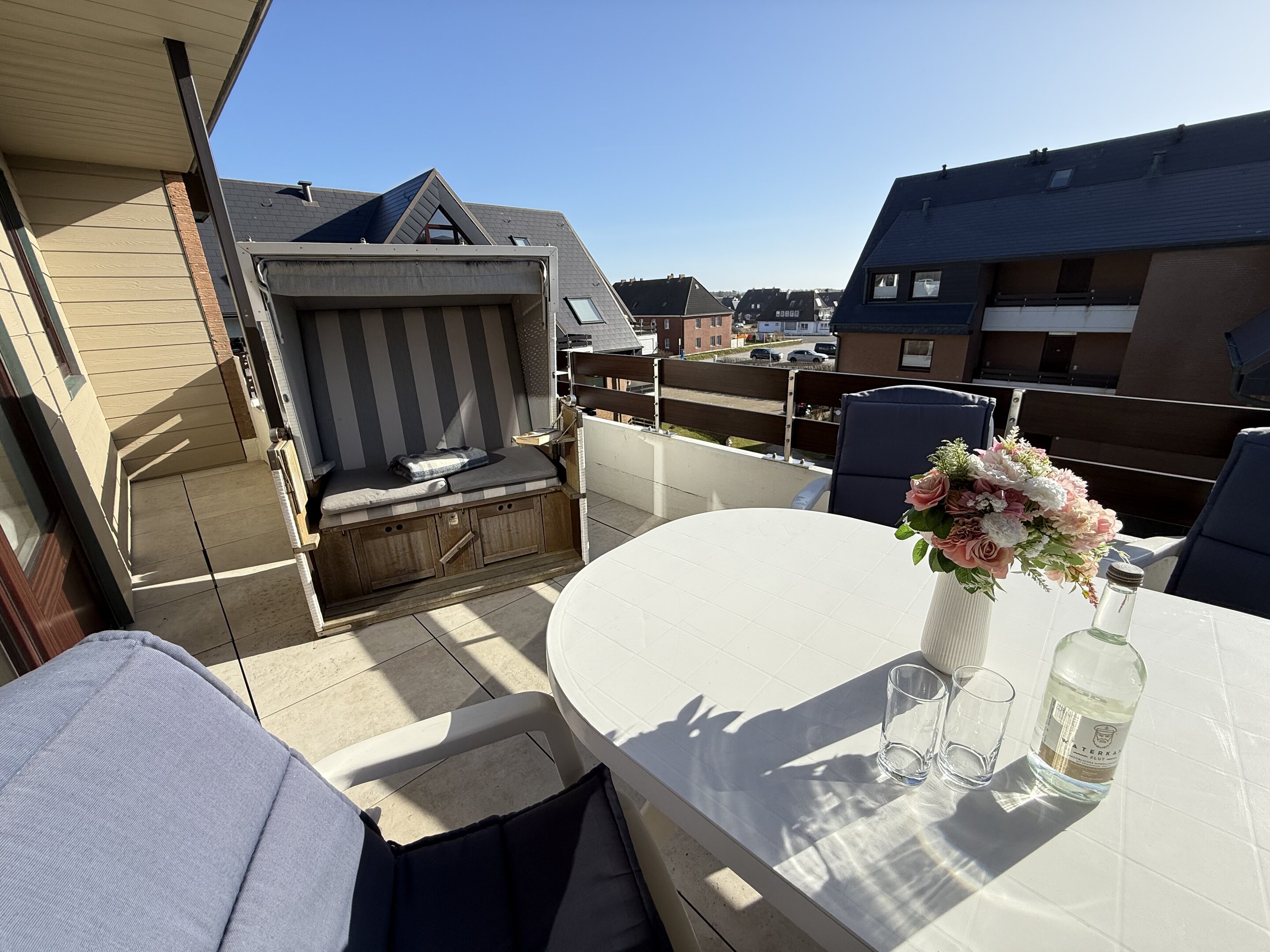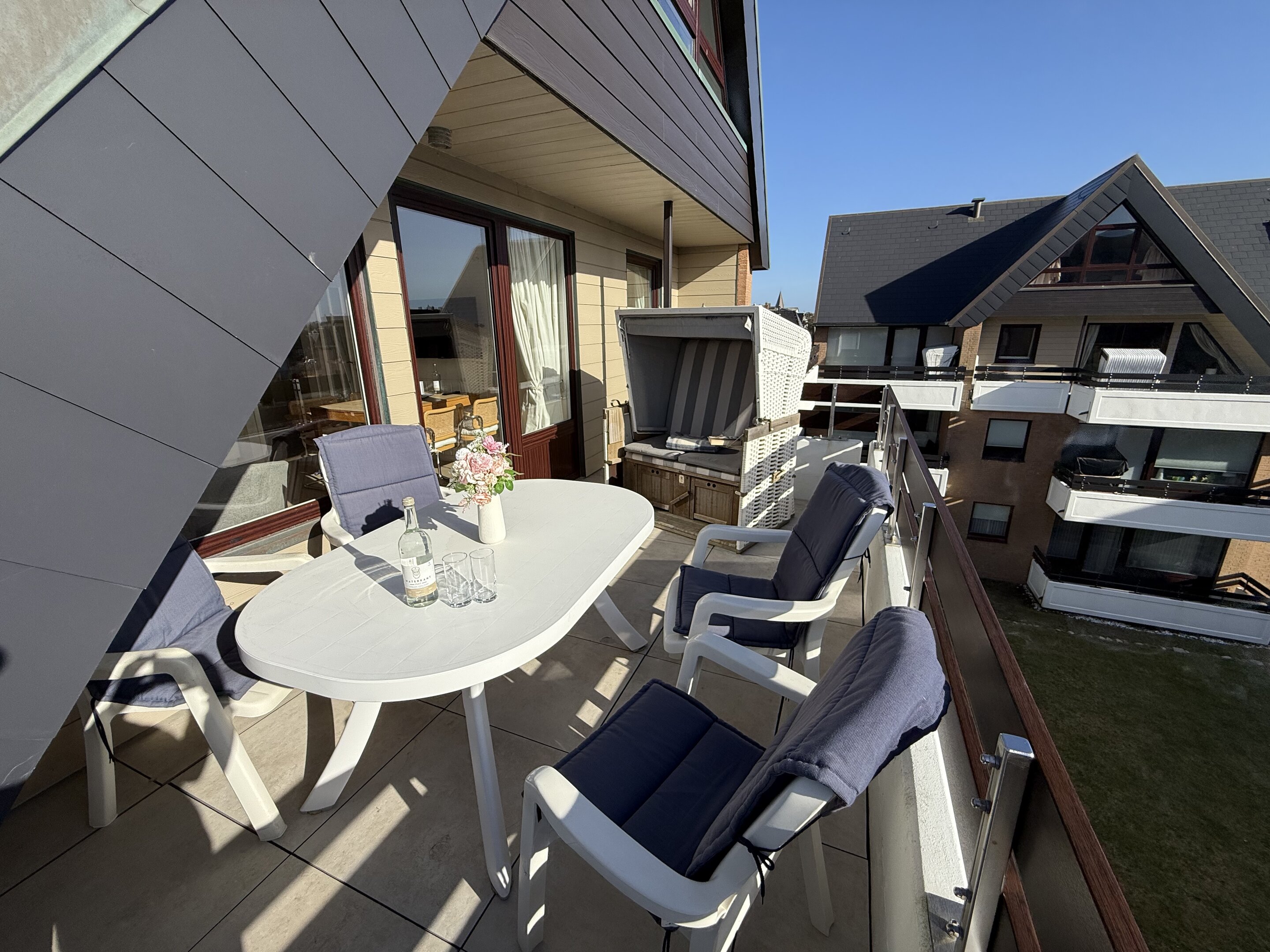 Diese hervorragend ausgestattete 2-Zimmer-Nichtraucher-Ferienwohnung mit ca. 79 m² Gesamtfläche bietet höchsten Komfort für bis zu 3 Personen. Sie liegt in der 2. Etage und verfügt über einen großzügigen Südbalkon, ausgestattet mit Balkonmöbeln, Auflagen und einem Strandkorb. Die zentrale und dennoch ruhige Lage direkt hinter den Dünen von Westerland macht sie zu einem perfekten Rückzugsort. Ein eigener PKW-Stellplatz am Haus ist ebenfalls vorhanden.