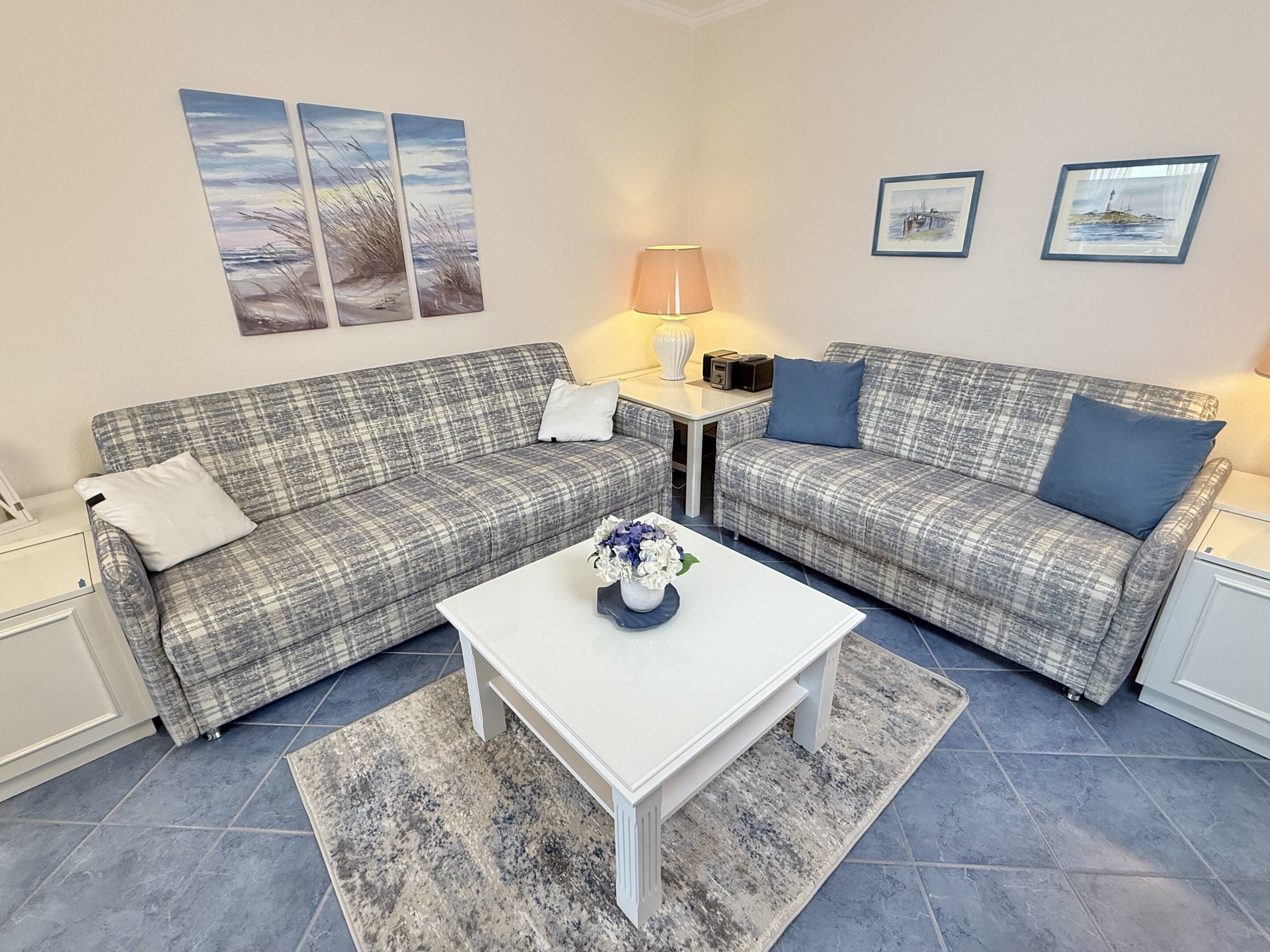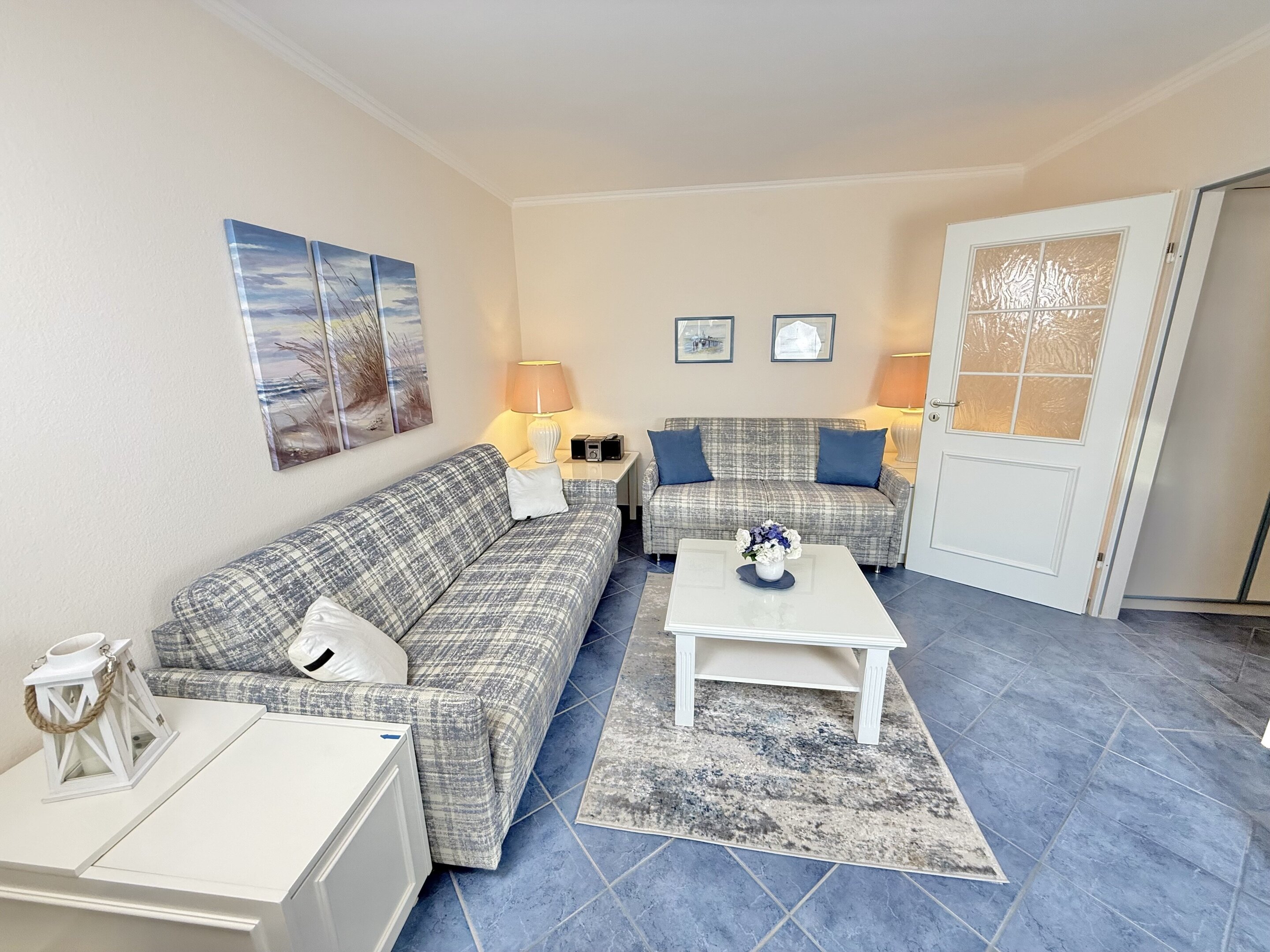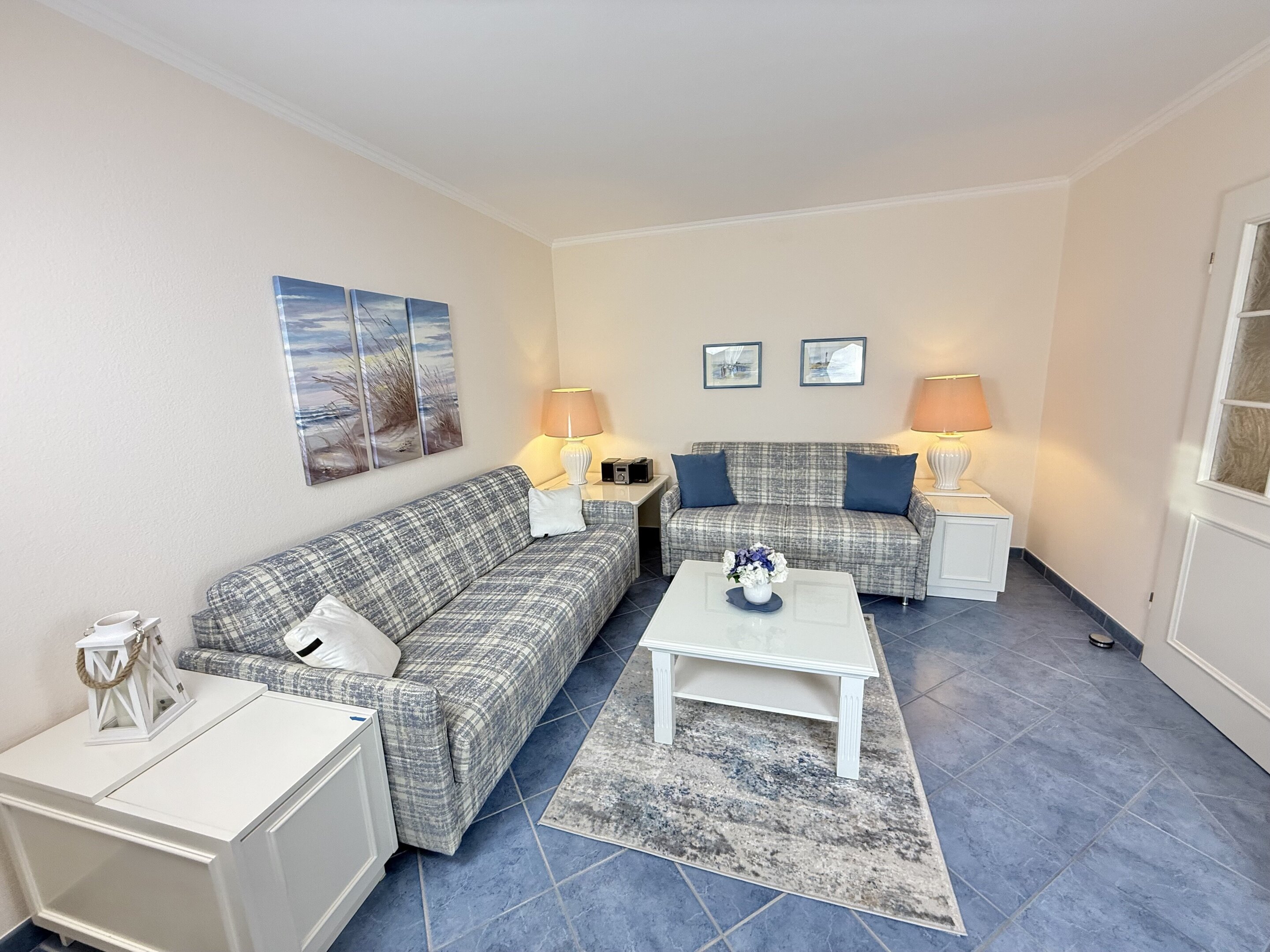 Diese komfortabel ausgestattete 2-Zimmer-Nichtraucher-Ferienwohnung mit ca. 48 m² Wohnfläche befindet sich im Hochparterre (vergleichbar mit dem 1. Obergeschoss) und ist zur Westseite ausgerichtet. Sie bietet ideale Voraussetzungen für einen erholsamen Aufenthalt. Das separate Schlafzimmer ist mit zwei Einzelbetten ausgestattet. Im Wohnbereich stehen eine komfortable Doppelschlafcouch (ca. 170 × 200 cm), ein Essplatz sowie ein Kabel-Flachbild-TV zur Verfügung. Darüber hinaus sind ein Telefon mit Flatrate ins deutsche Festnetz sowie WLAN vorhanden. Die offene Küche ist vollständig ausgestattet und verfügt über einen Geschirrspüler, Backofen, Cerankochfeld sowie Kaffeemaschine, Wasserkocher und Toaster. Das moderne Duschbad mit WC rundet das Raumangebot ab.