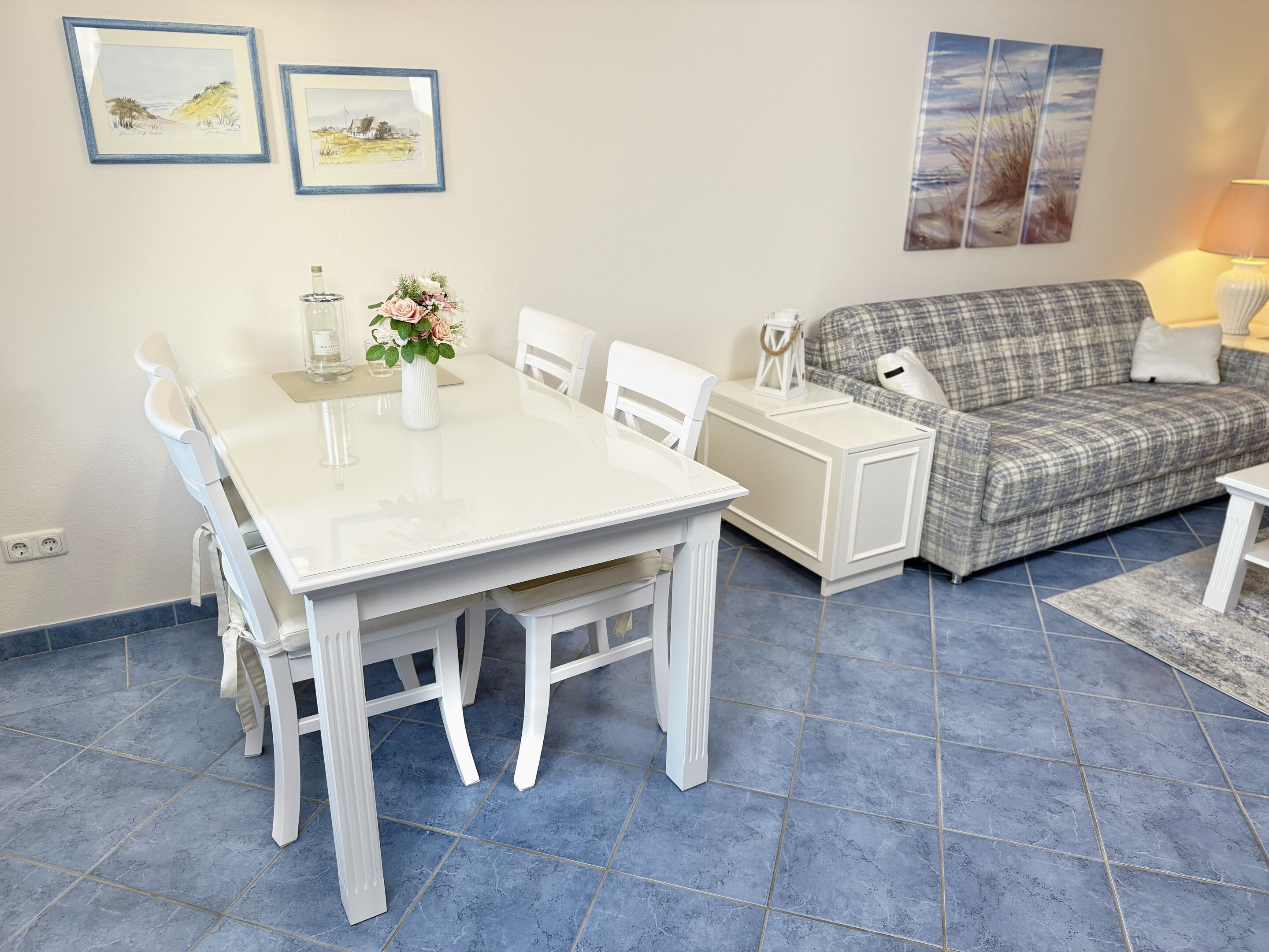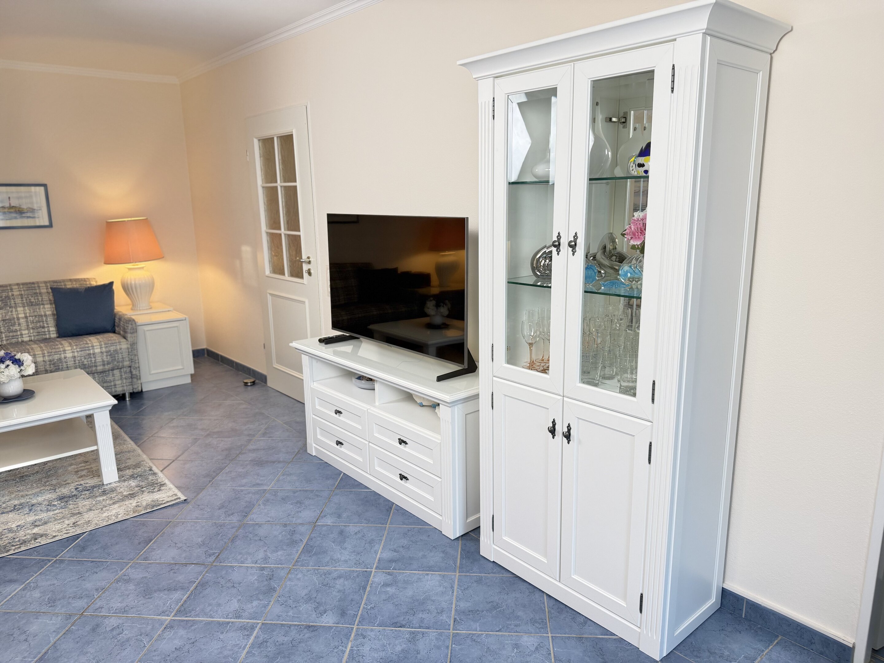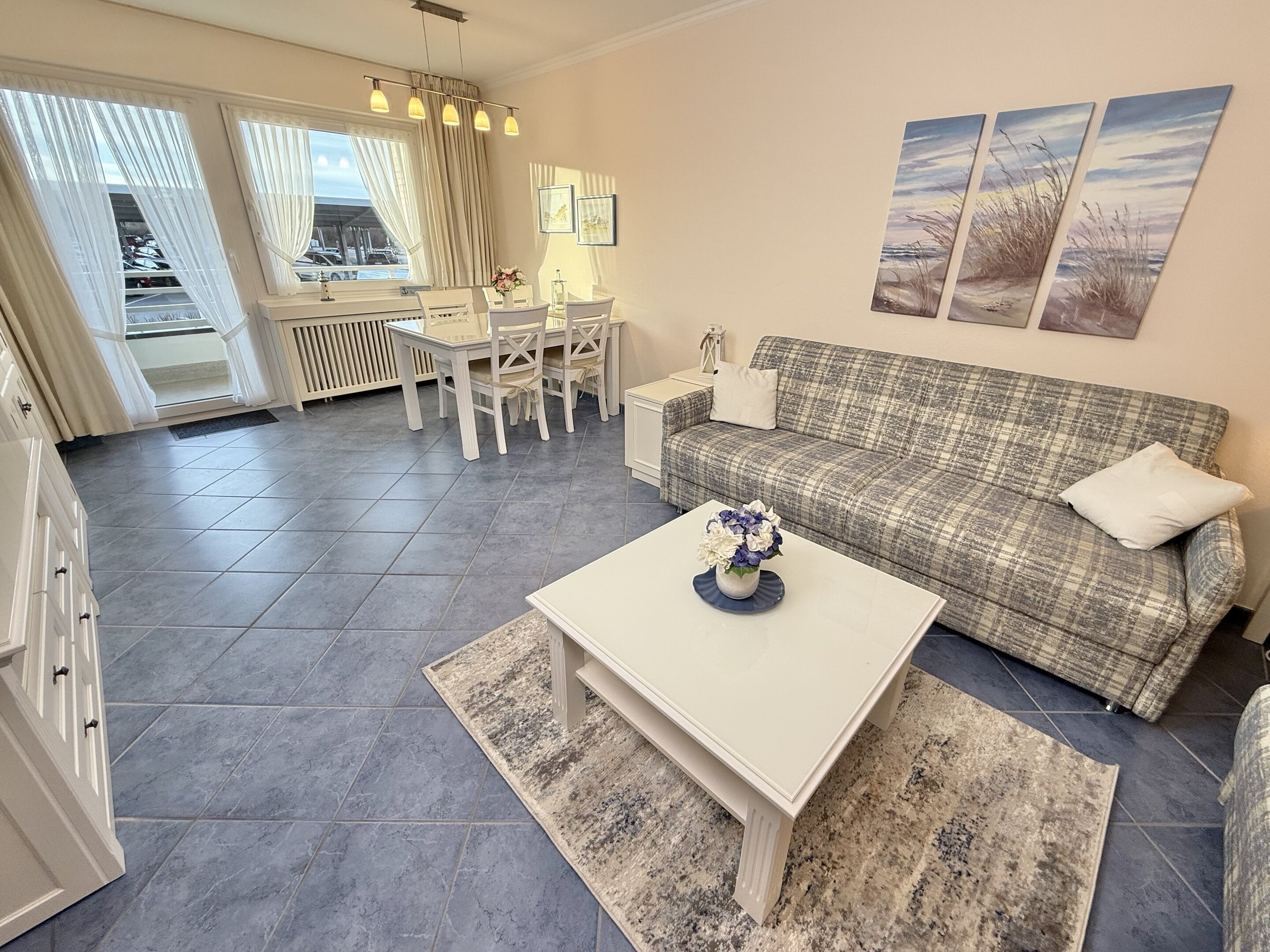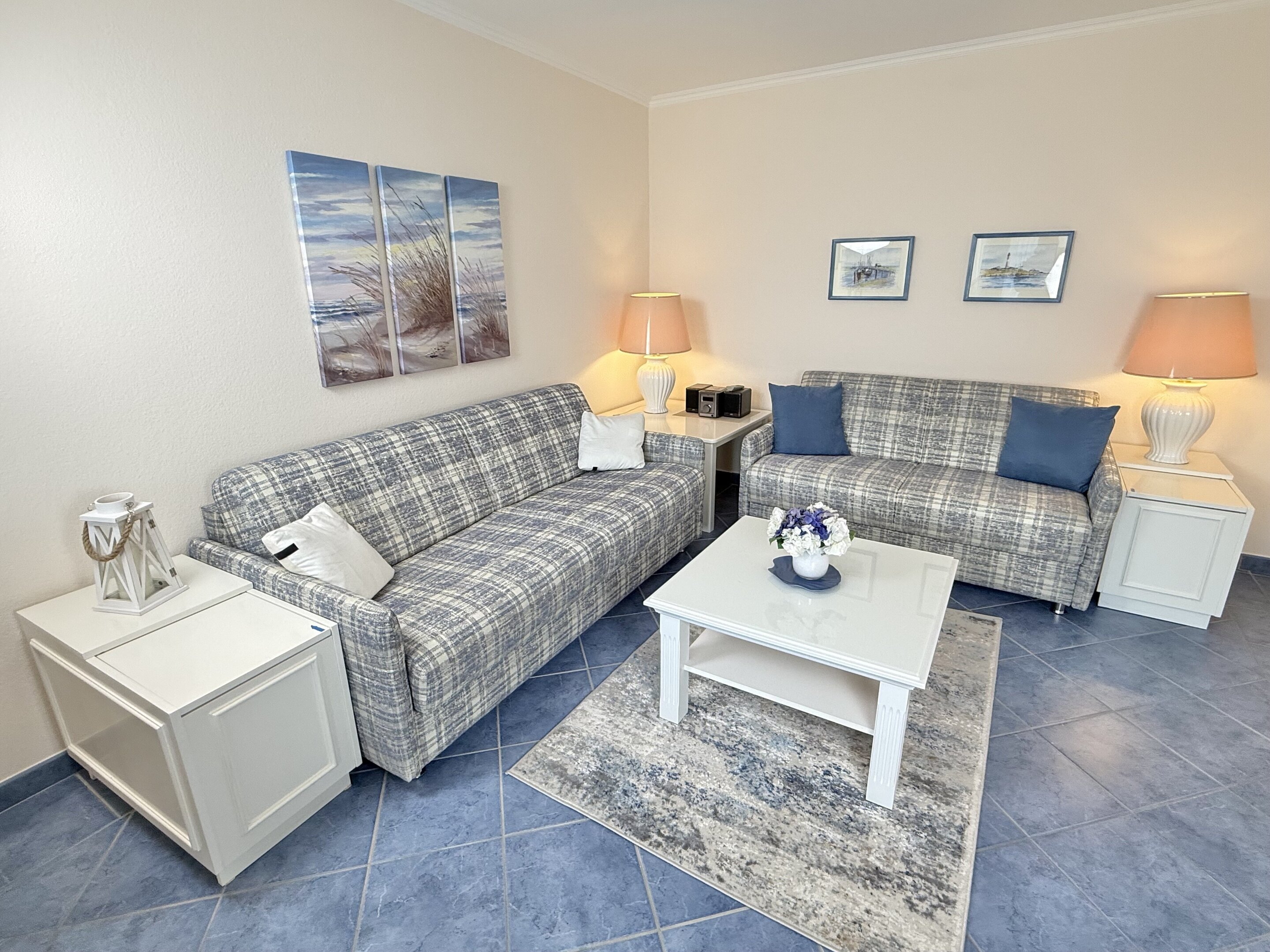 Diese komfortabel ausgestattete 2-Zimmer-Nichtraucher-Ferienwohnung mit ca. 48 m² Wohnfläche befindet sich im Hochparterre (vergleichbar mit dem 1. Obergeschoss) und ist zur Westseite ausgerichtet. Sie bietet ideale Voraussetzungen für einen erholsamen Aufenthalt. Das separate Schlafzimmer ist mit zwei Einzelbetten ausgestattet. Im Wohnbereich stehen eine komfortable Doppelschlafcouch (ca. 170 × 200 cm), ein Essplatz sowie ein Kabel-Flachbild-TV zur Verfügung. Darüber hinaus sind ein Telefon mit Flatrate ins deutsche Festnetz sowie WLAN vorhanden. Die offene Küche ist vollständig ausgestattet und verfügt über einen Geschirrspüler, Backofen, Cerankochfeld sowie Kaffeemaschine, Wasserkocher und Toaster. Das moderne Duschbad mit WC rundet das Raumangebot ab.