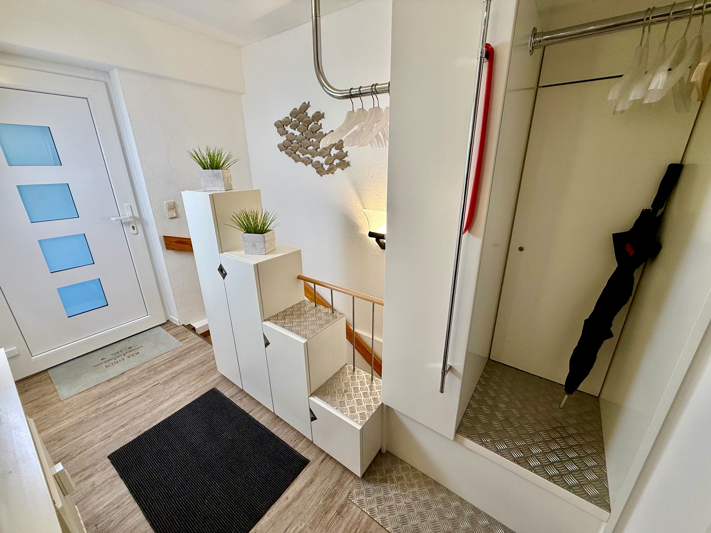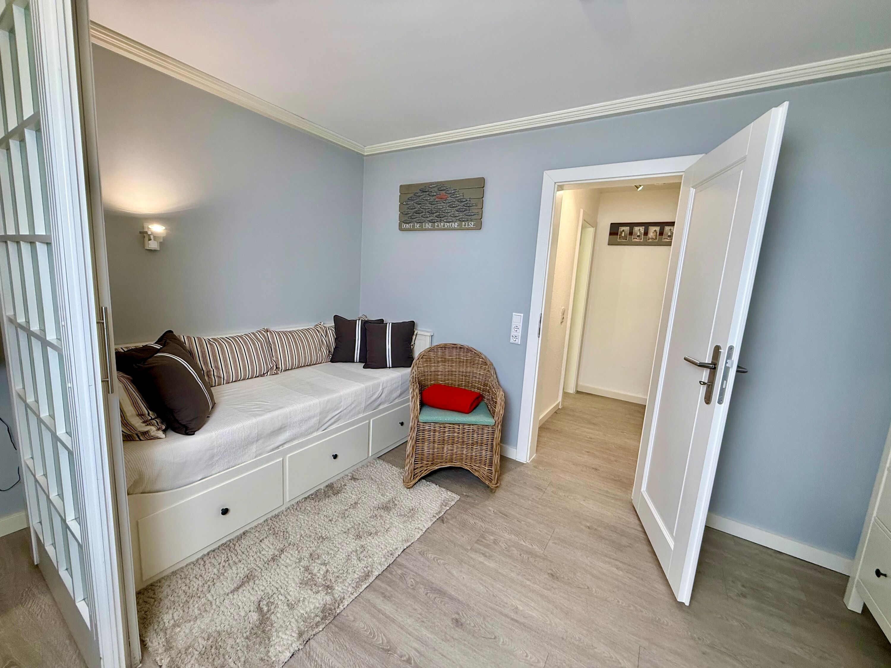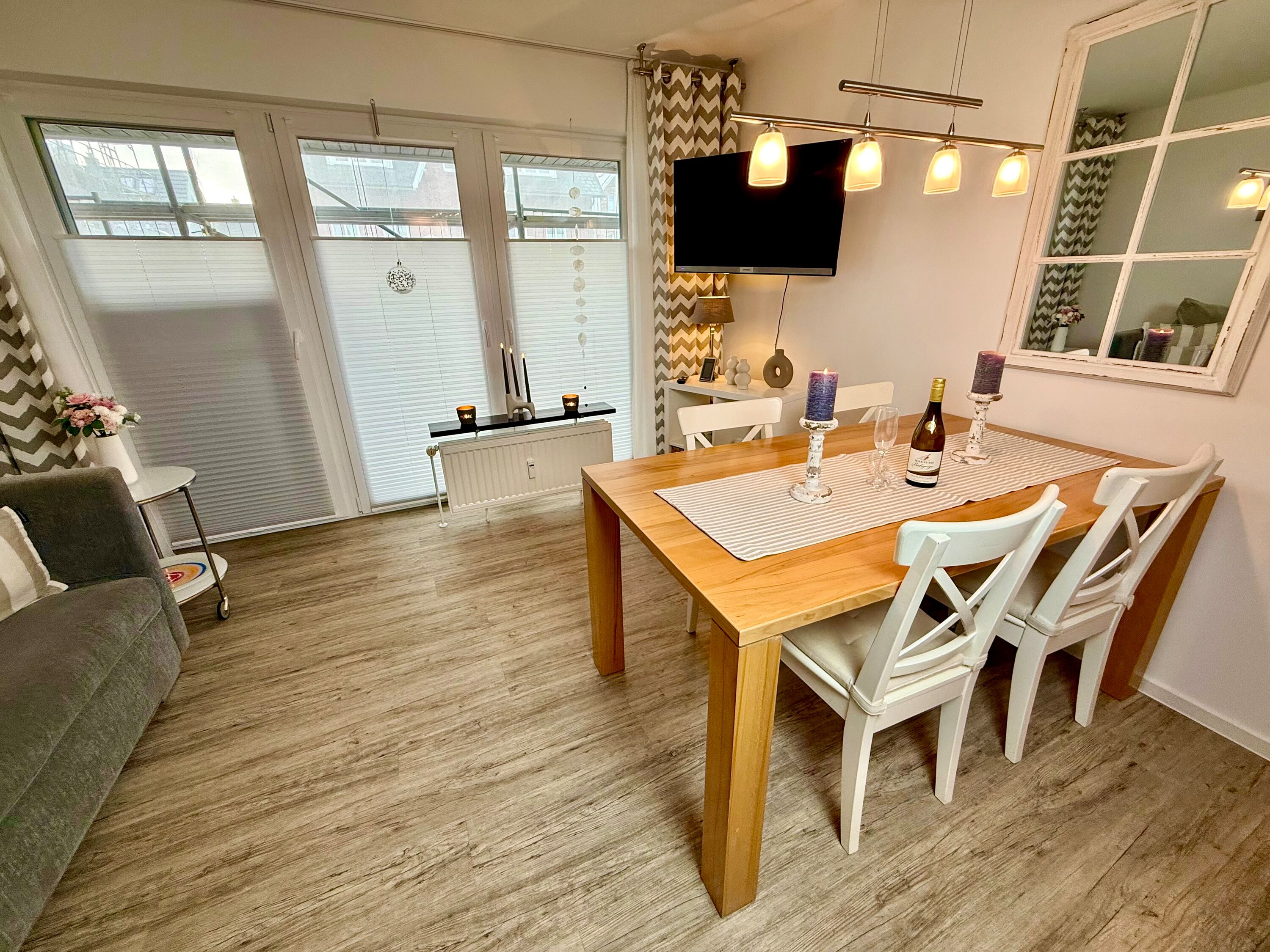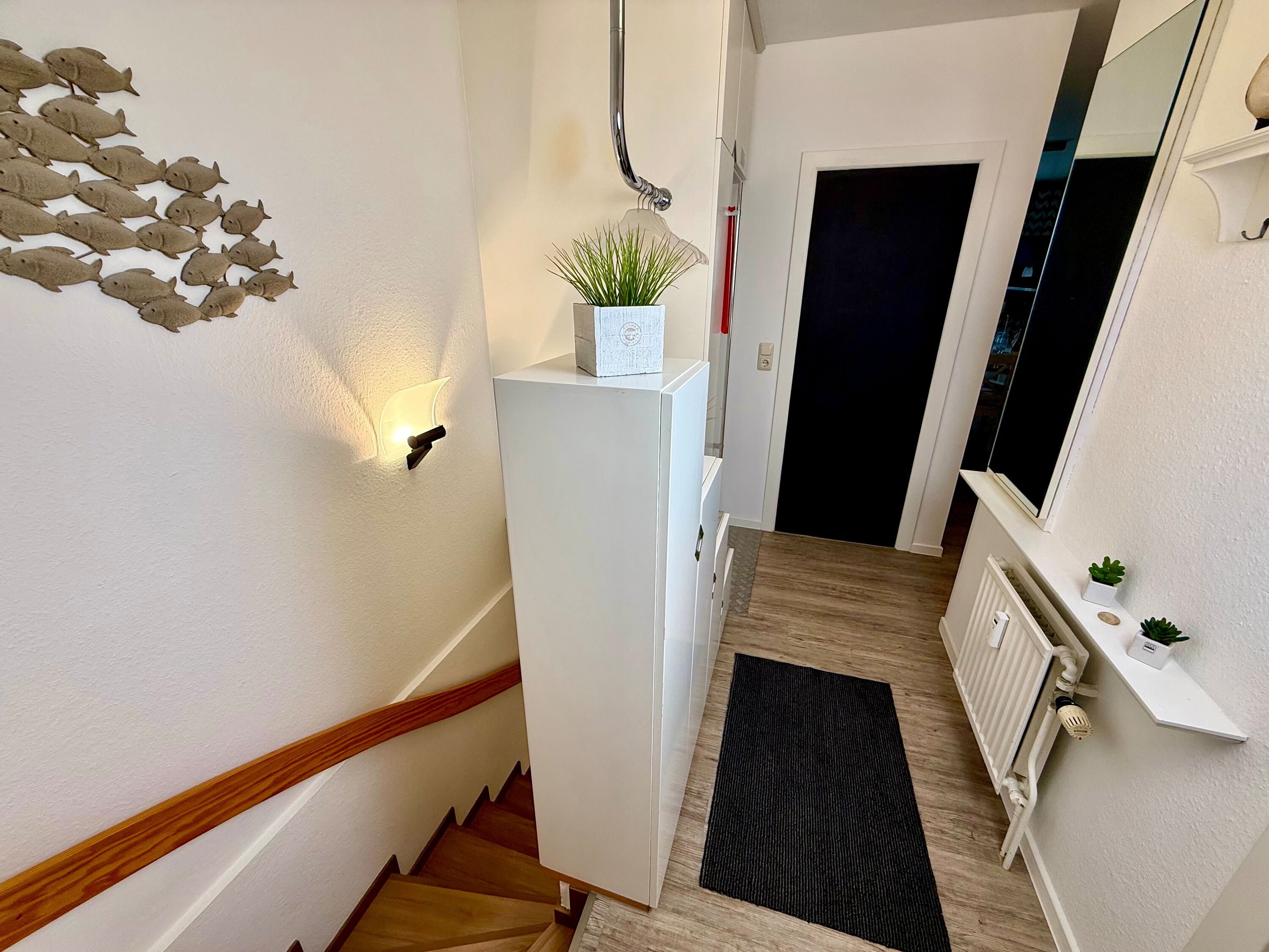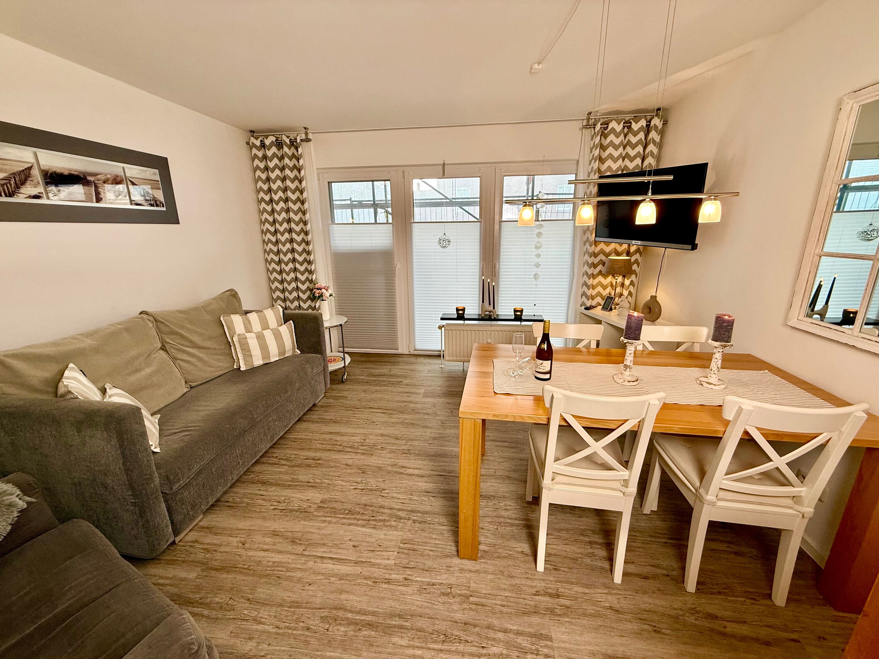 Aufteilung: Im Erdgeschoss gelangt man von der Diele mit Garderobe in das Duschbad/WC, in das Wohnzimmer mit Austritt zu der sonnigen Südterrasse mit Strandkorb sowie der offenen Küche. Im Wohnraum steht eine gemütliche Couchgarnitur (mit Schlaffunktion, Liegefläche 1,80 x 2,00 m) zur Verfügung.