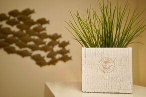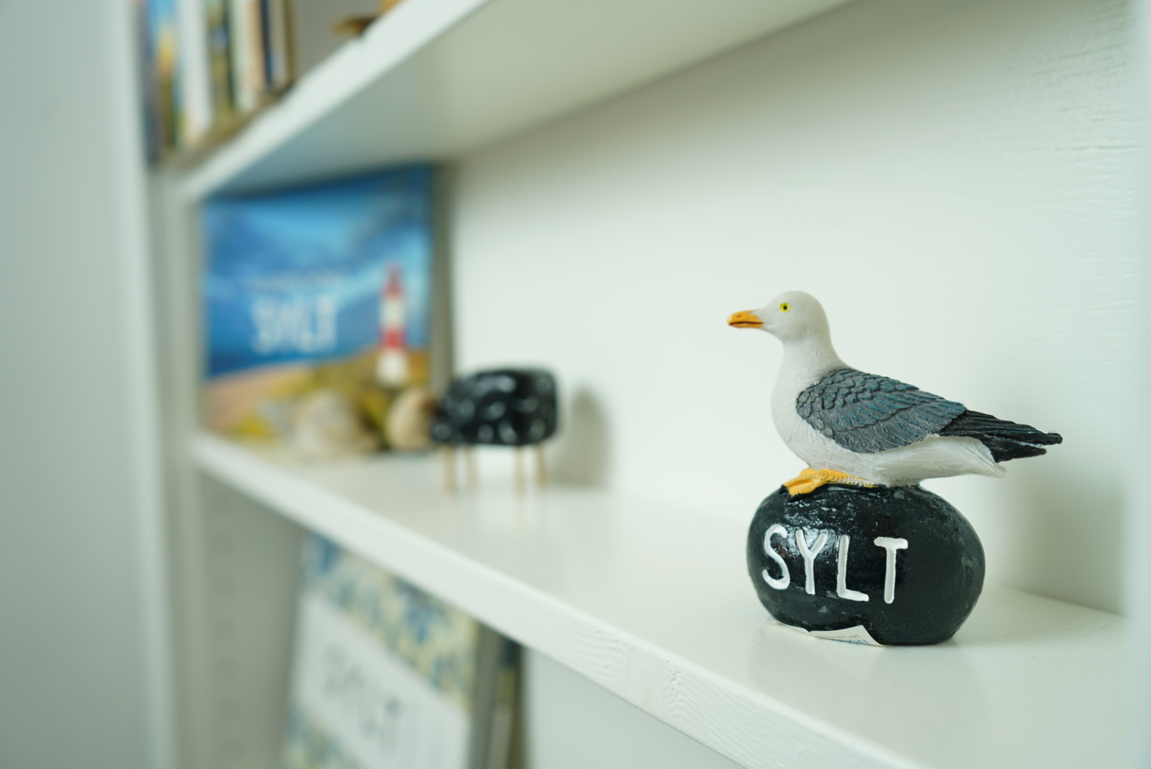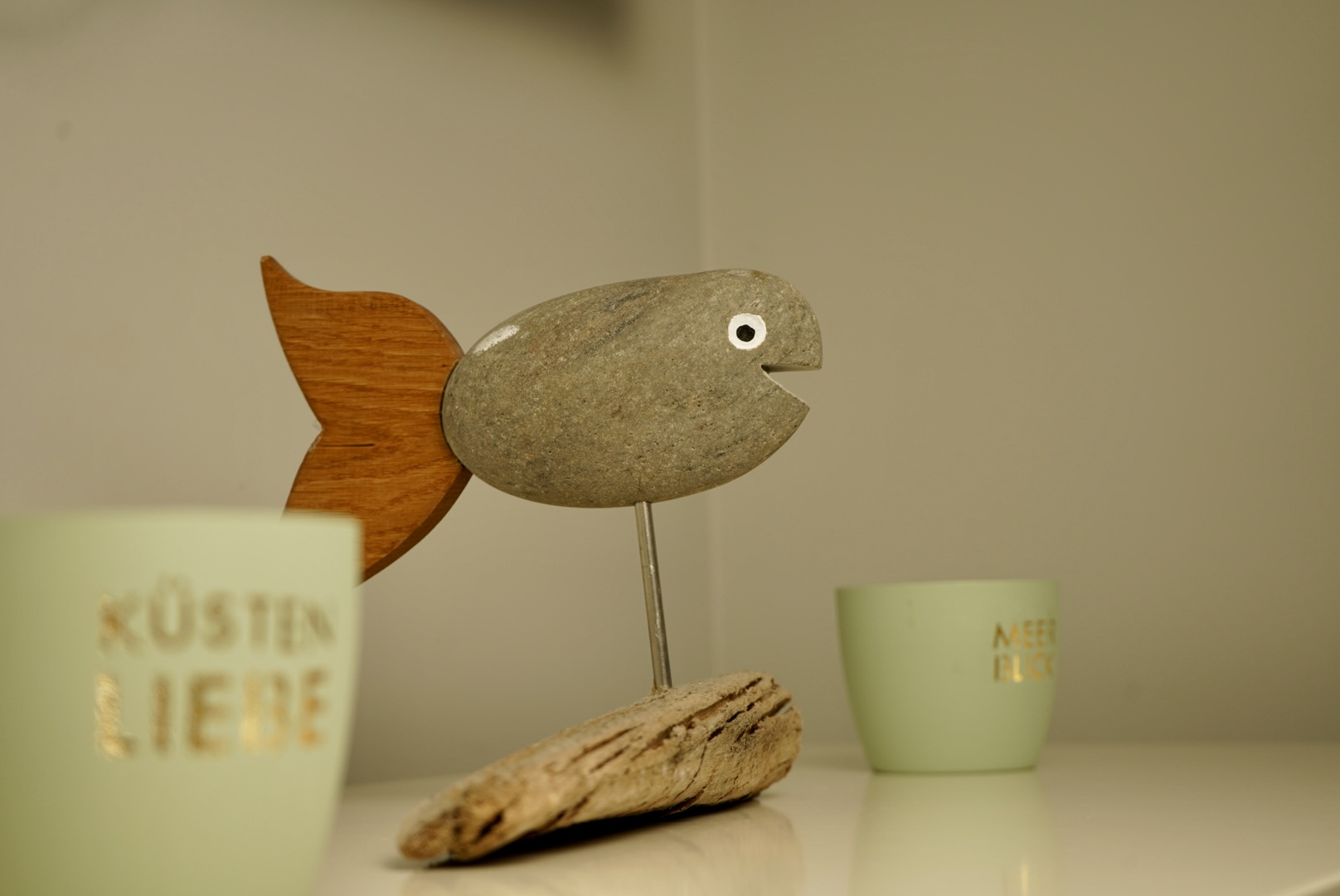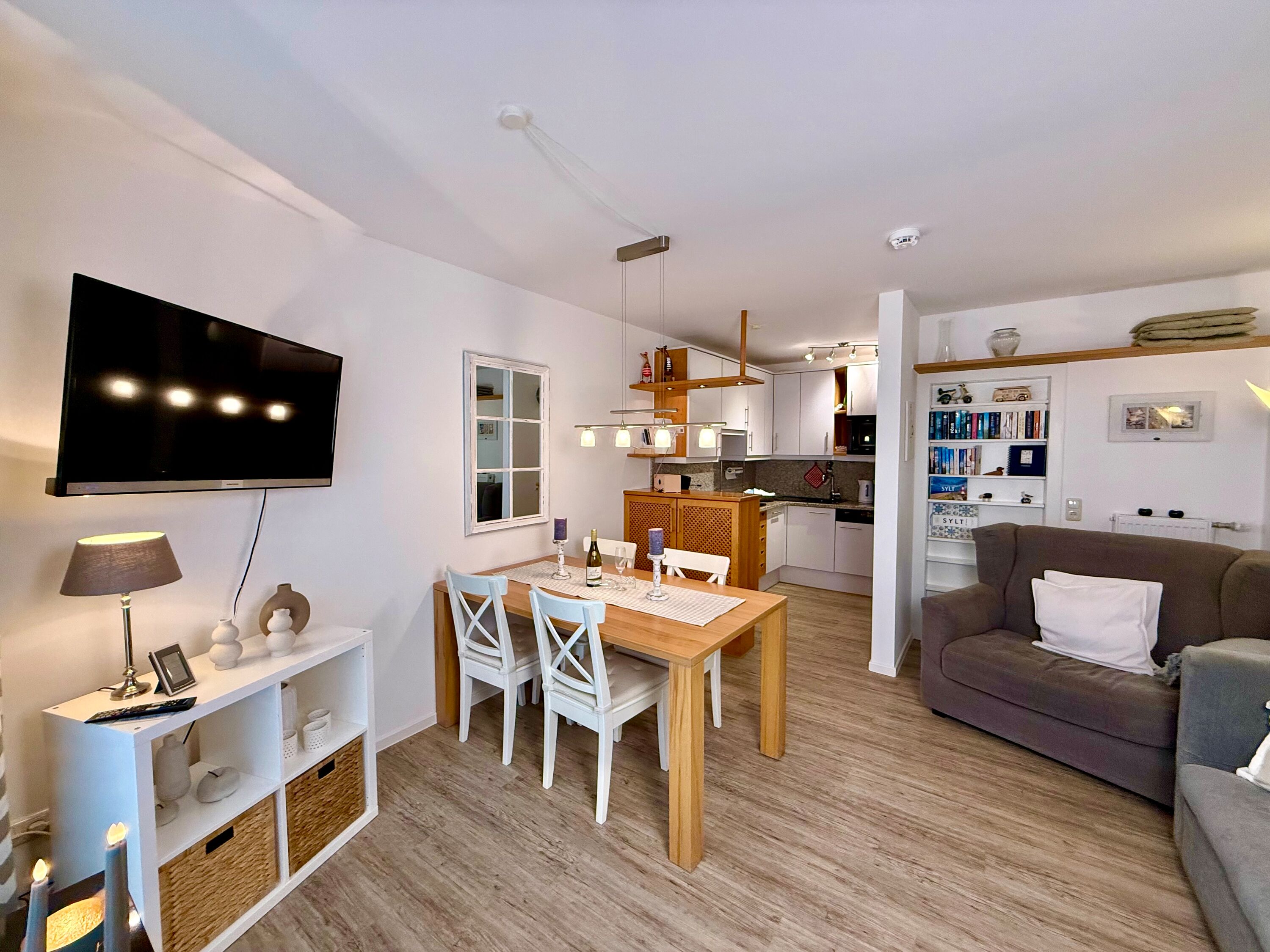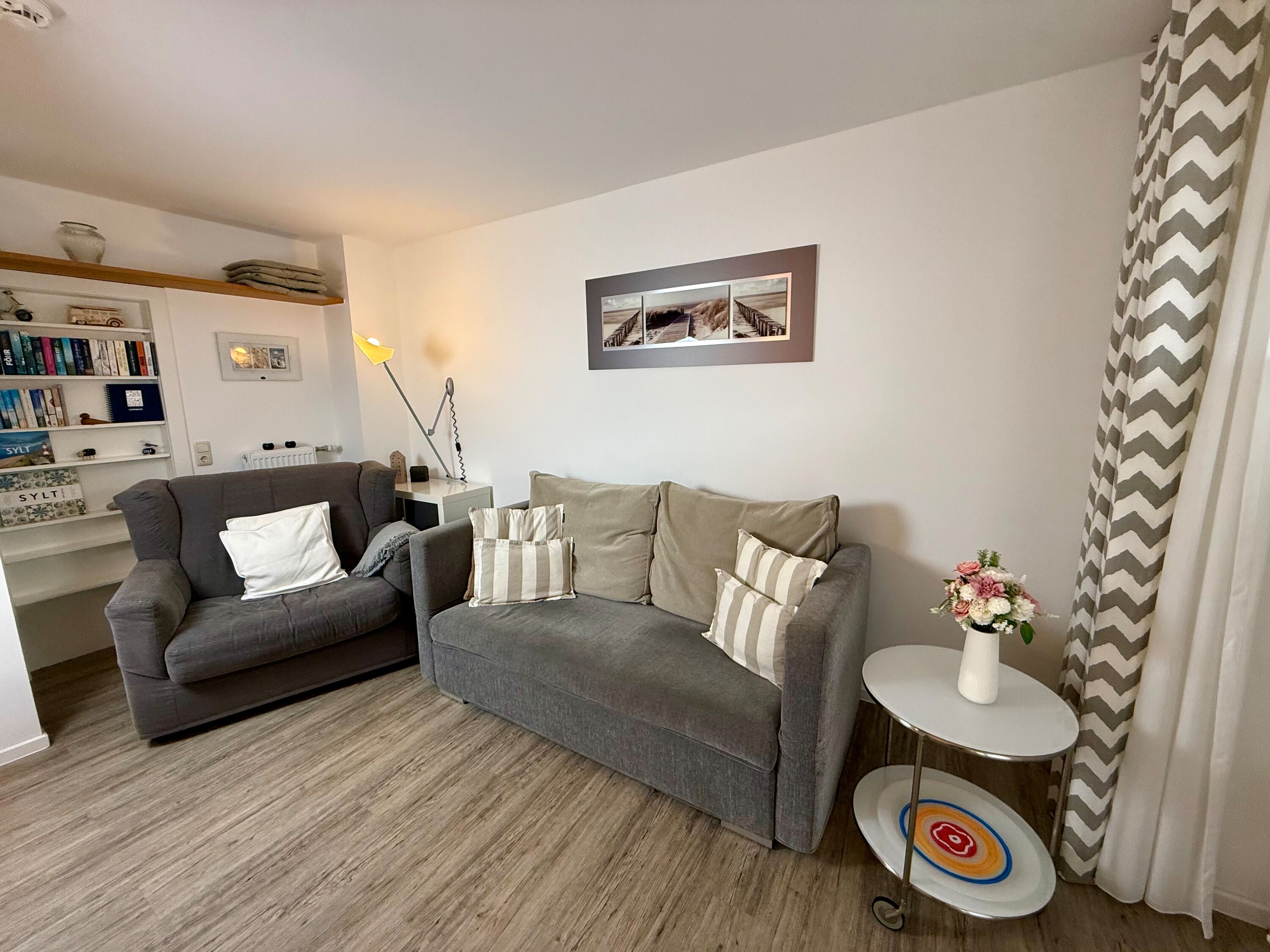 Aufteilung: Im Erdgeschoss gelangt man von der Diele mit Garderobe in das Duschbad/WC, in das Wohnzimmer mit Austritt zu der sonnigen Südterrasse mit Strandkorb sowie der offenen Küche. Im Wohnraum steht eine gemütliche Couchgarnitur (mit Schlaffunktion, Liegefläche 1,80 x 2,00 m) zur Verfügung.
