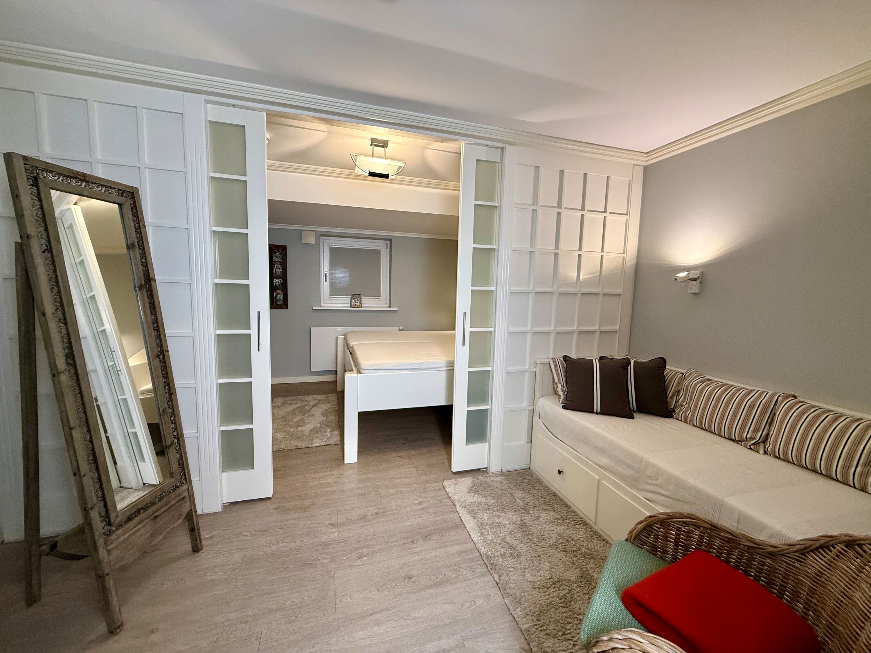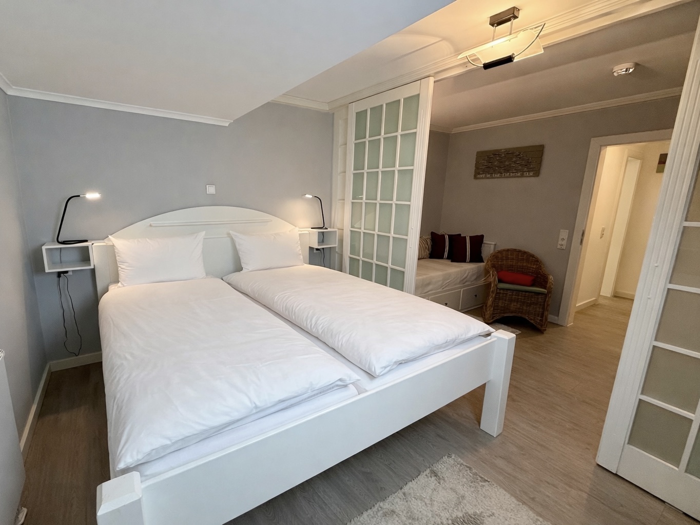 Von der Diele aus gelangt man über eine Treppe in das Untergeschoss des Hauses. Dort stehen ein großzügiges Schlafzimmer und ein Duschbad-WC zur Verfügung. Das Schlafzimmer verfügt über ein Doppelbett (mit guten Einzelmatratzen), zusätzlich ein Einzelbett (ausziehbar zum Doppelbett) und ein Kleiderschrank