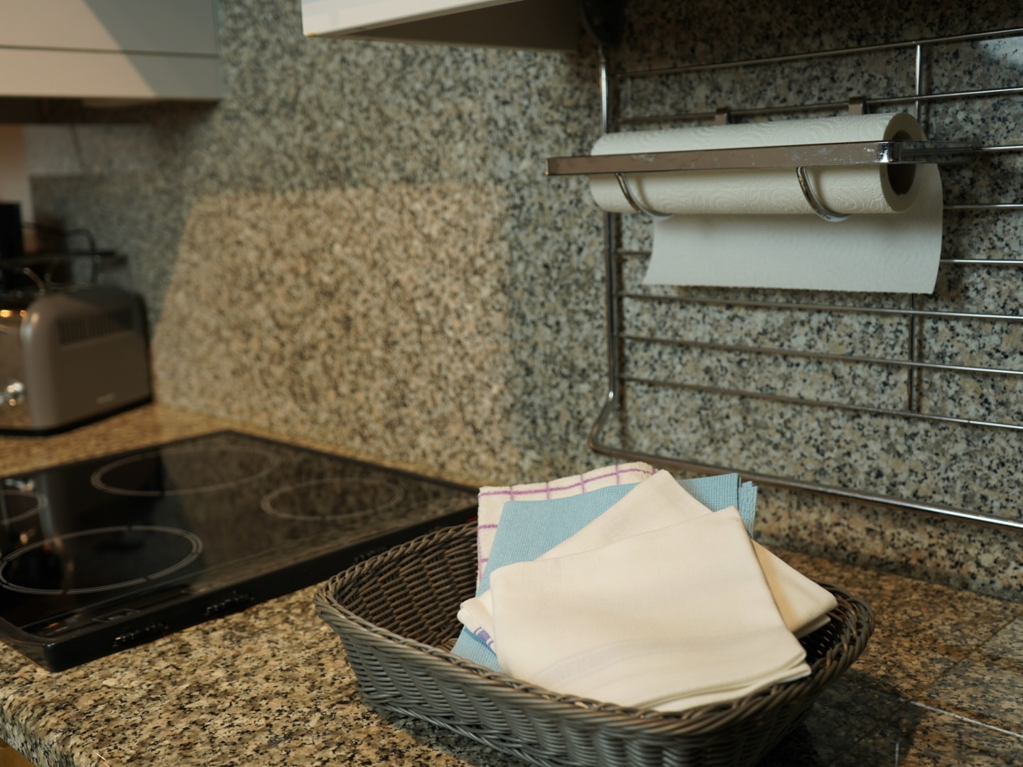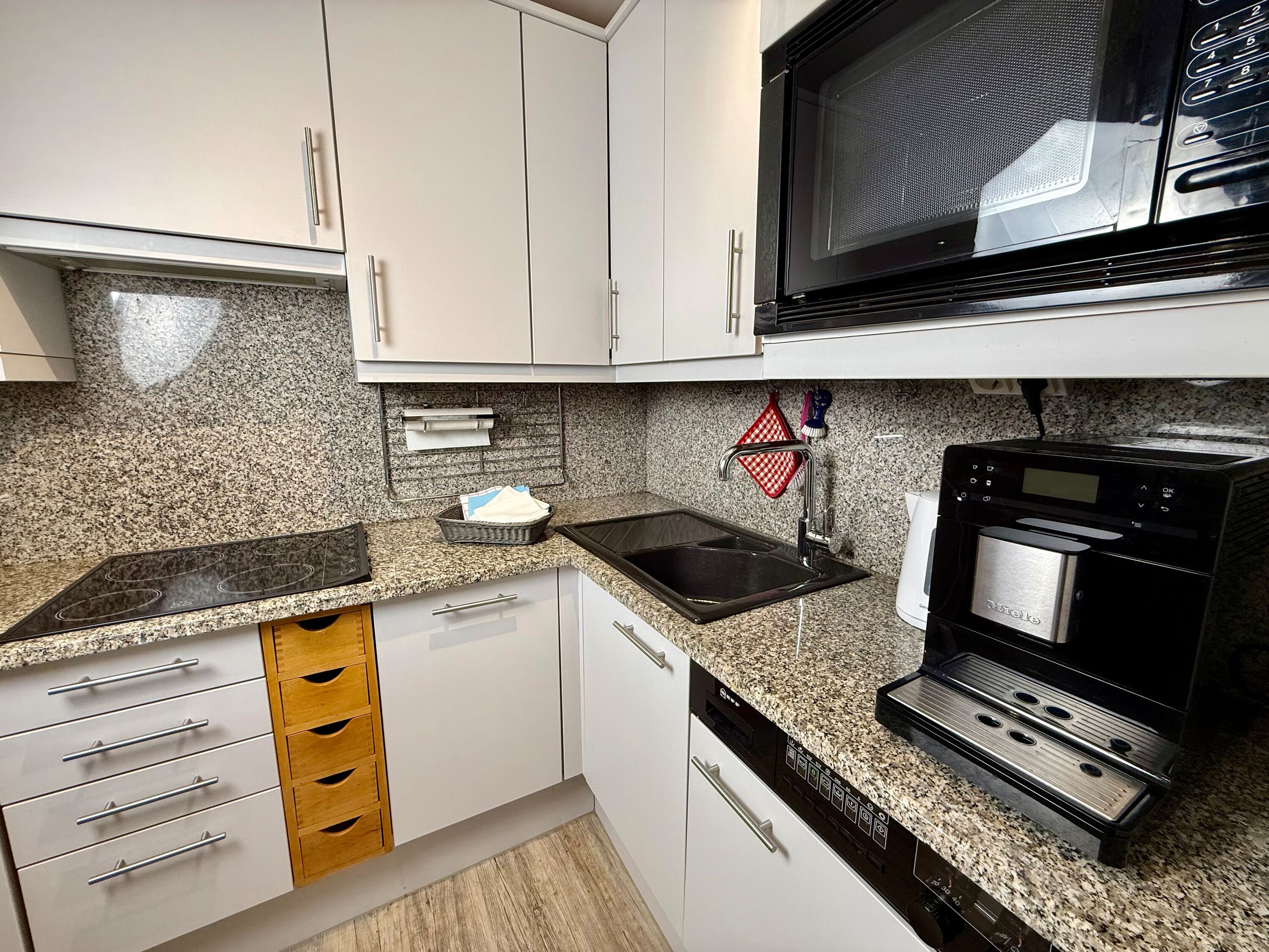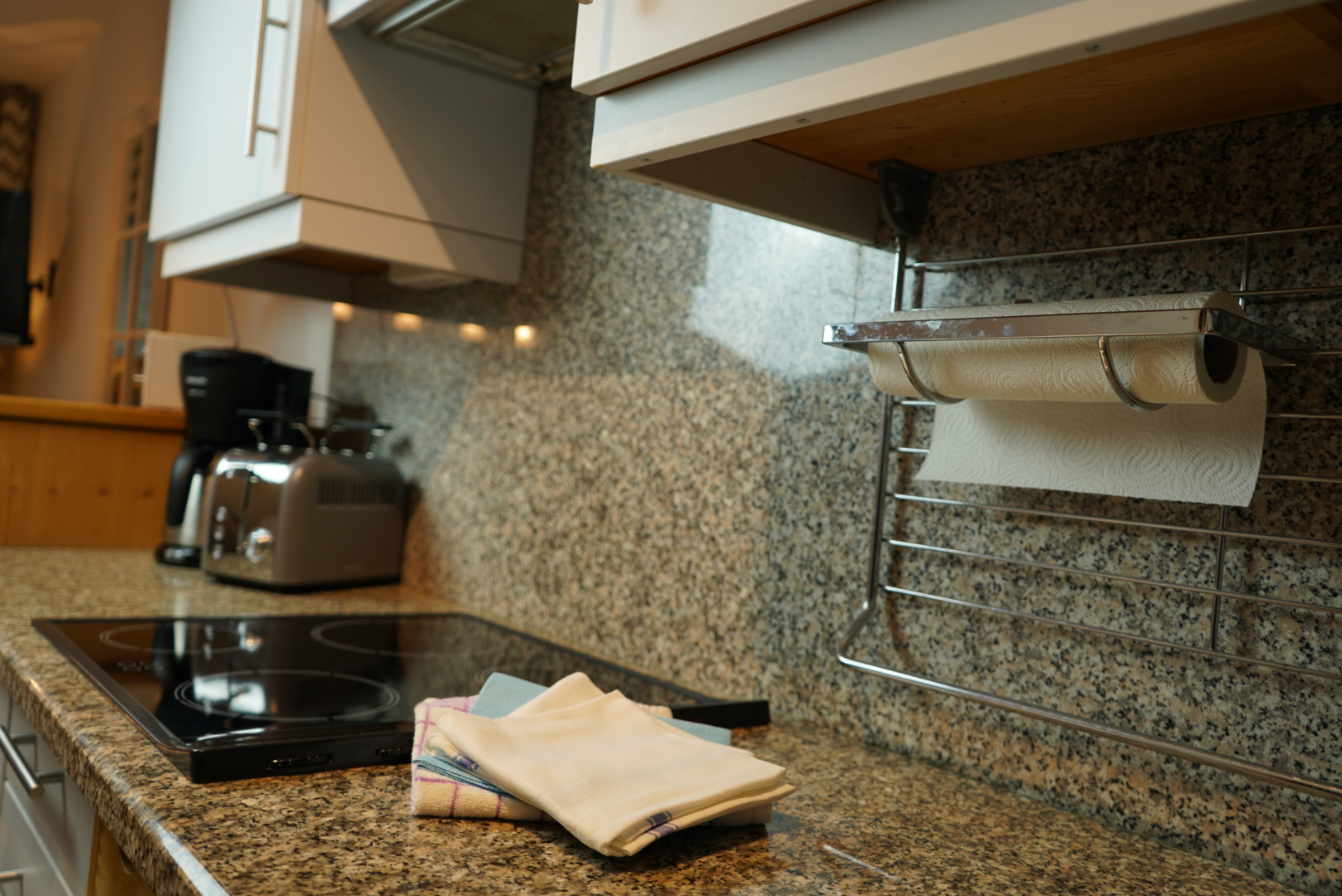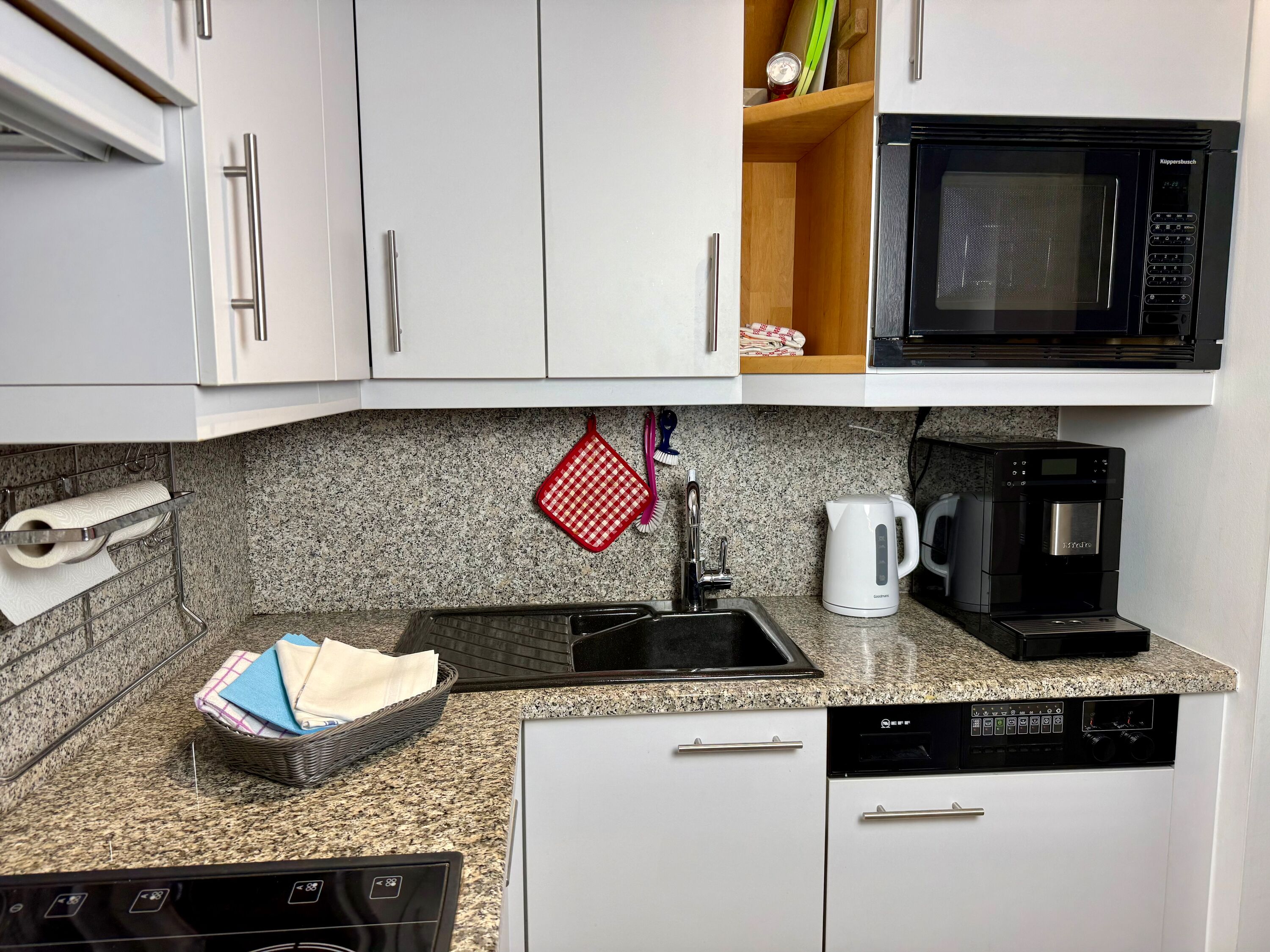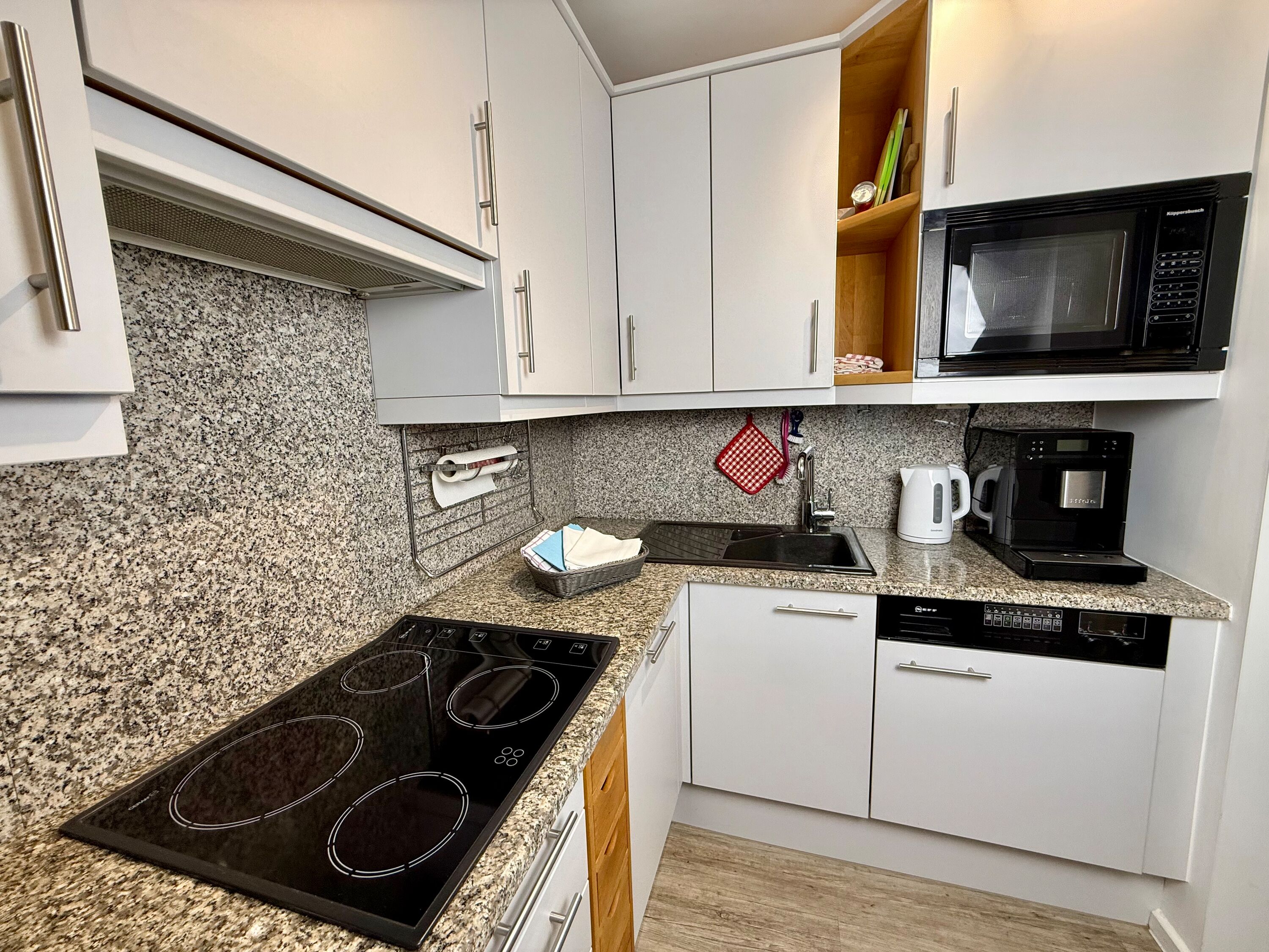 Die offene Einbau-Küche hat eine Mikrowelle mit Grillfunktion, ein Ceranfeld und einen Kühlschrank (kein Gefrierfach) Kaffeemaschine, Wasserkocher und Toaster gehören zur Grundausstattung.