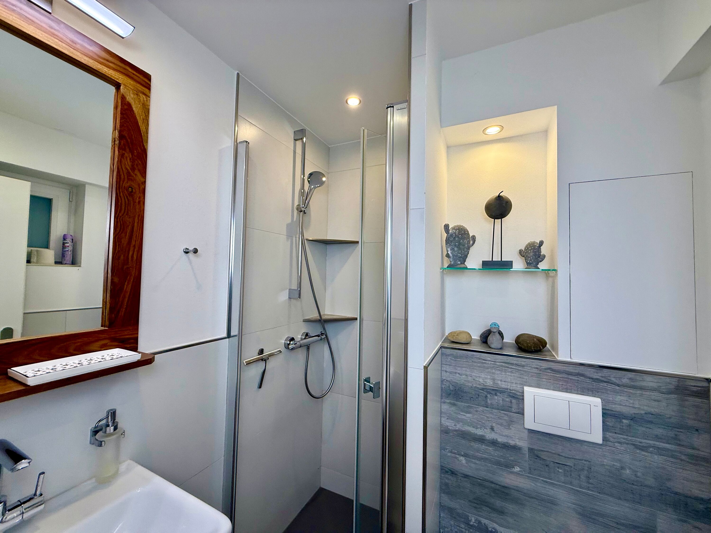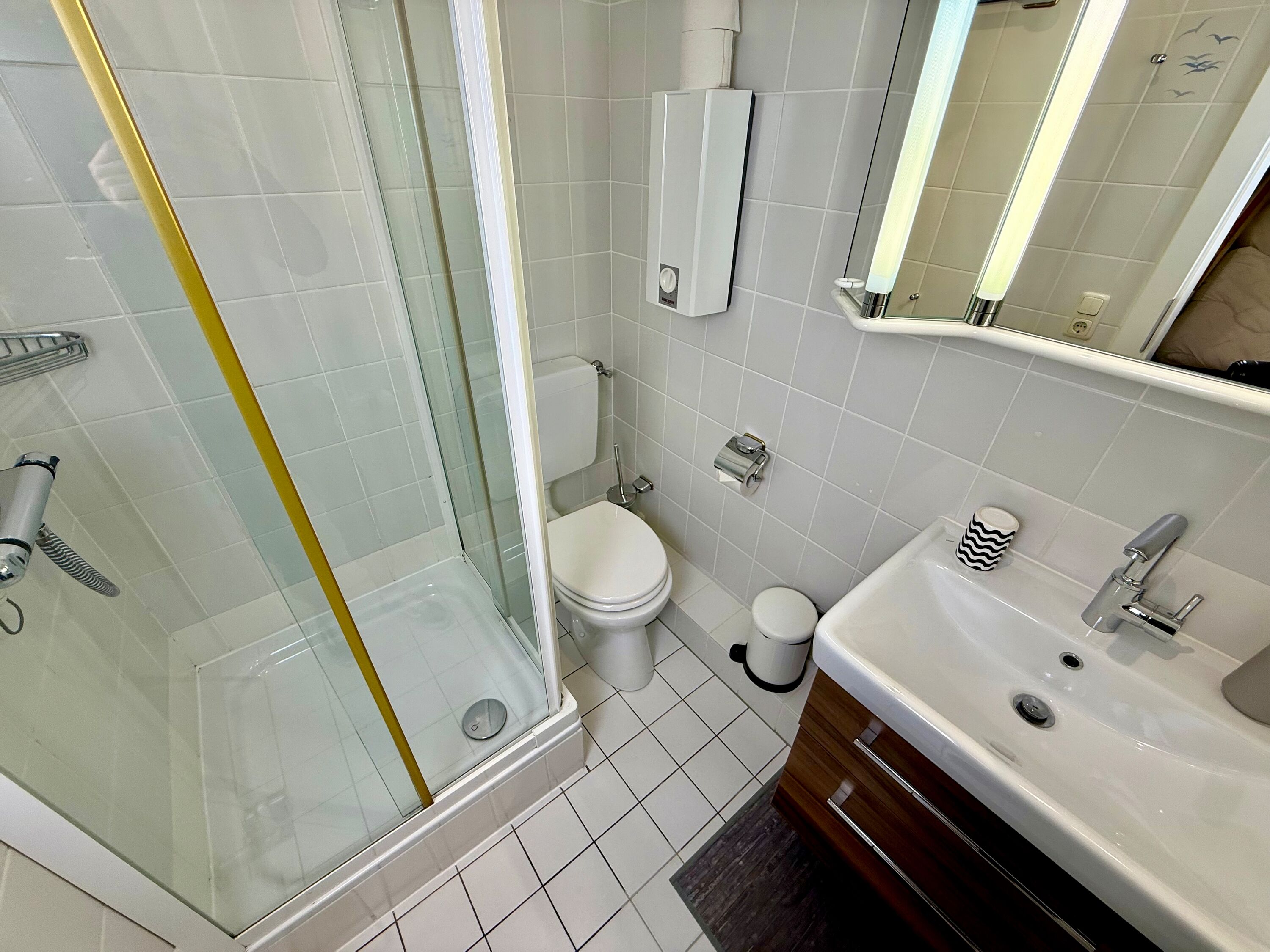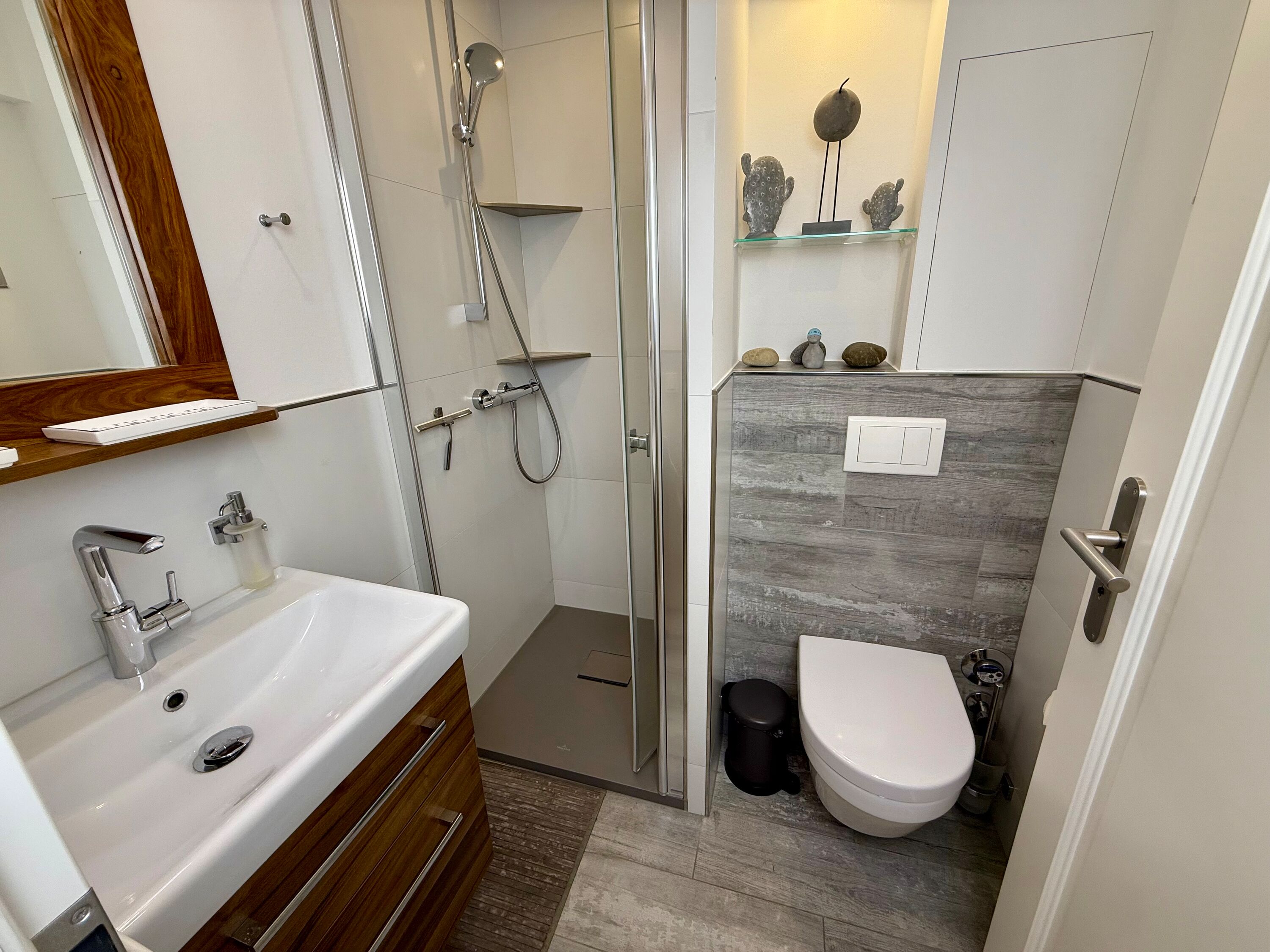 Das Badezimmer ist mit einer Dusche, einem Waschtisch, WC und Fenster ausgestattet.