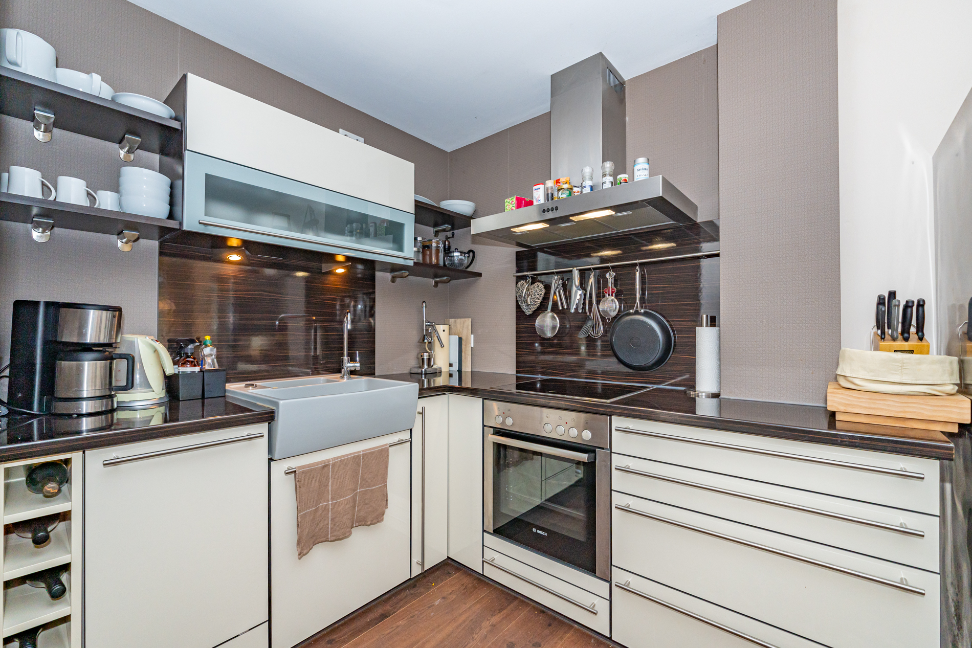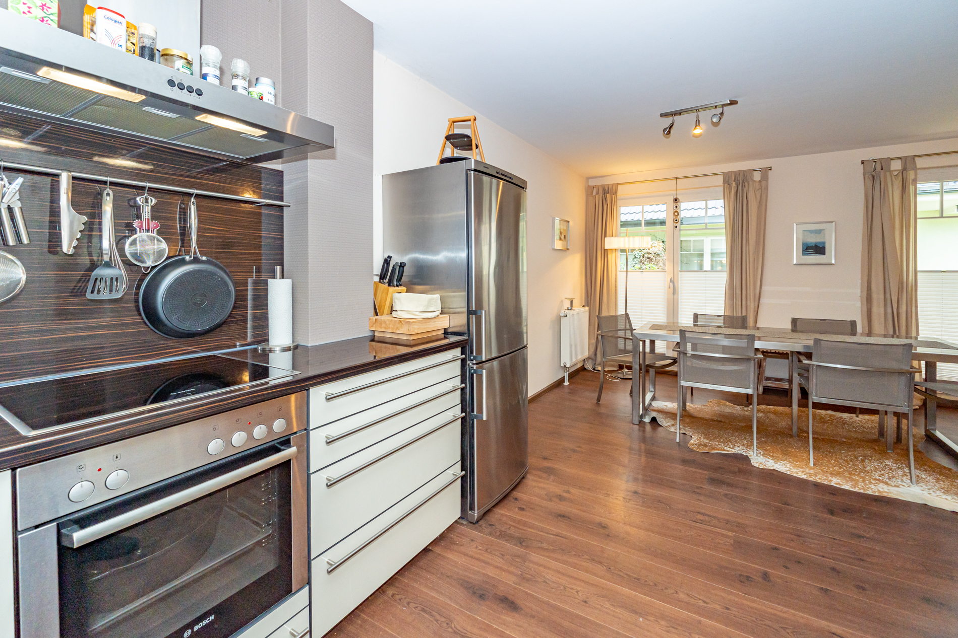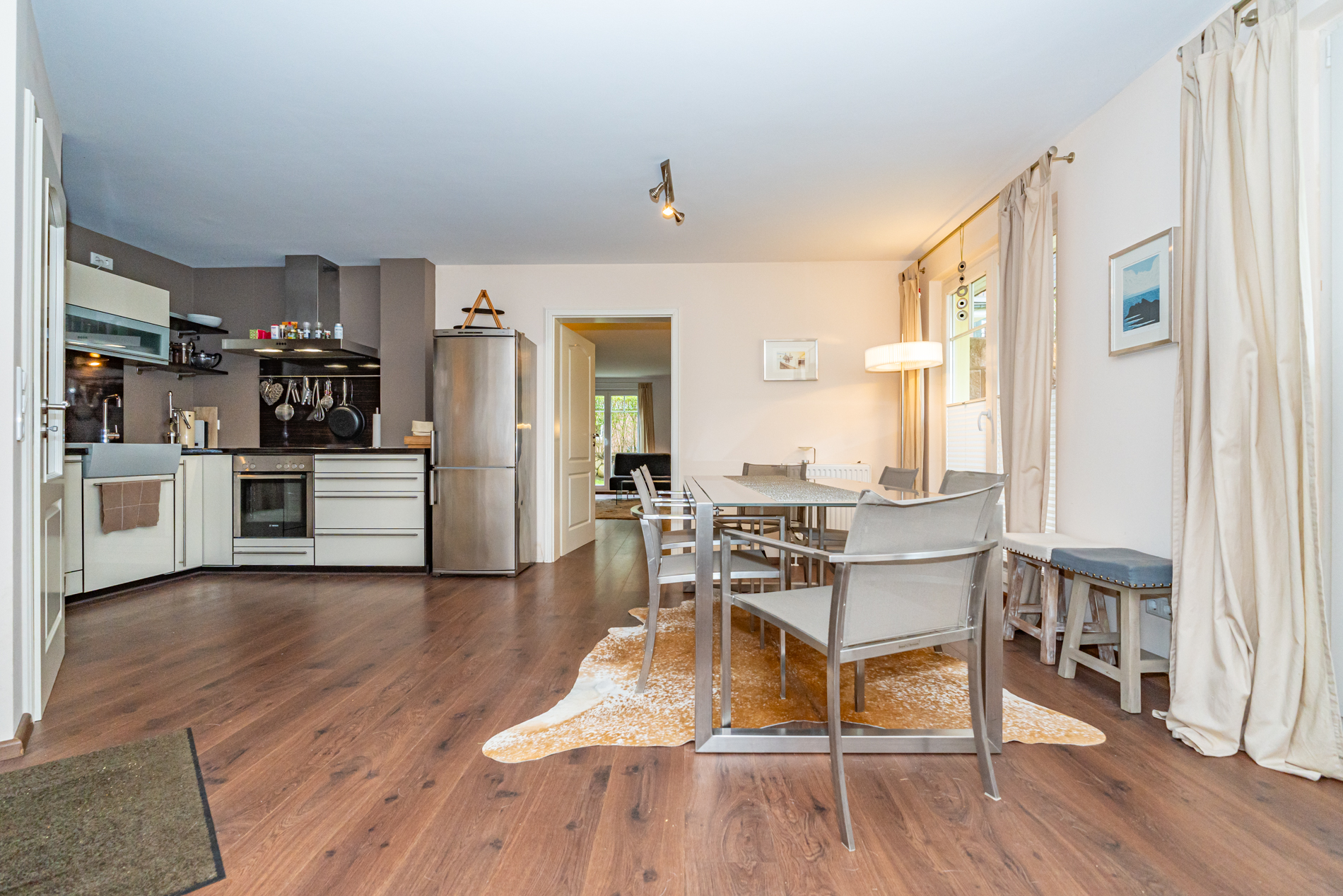 Das Esszimmer ist mit einer offenen Einbauküche ausgestattet, die über alle nötigen Komfortmerkmale verfügt. Hierzu gehören ein Ceranfeld mit 4 Kochfeldern, ein Backofen, ein Geschirrspüler sowie ein amerikanischer Kühlschrank mit Gefrierschubfächern. Außerdem gibt es einen großzügigen Esstisch für 6 Personen.