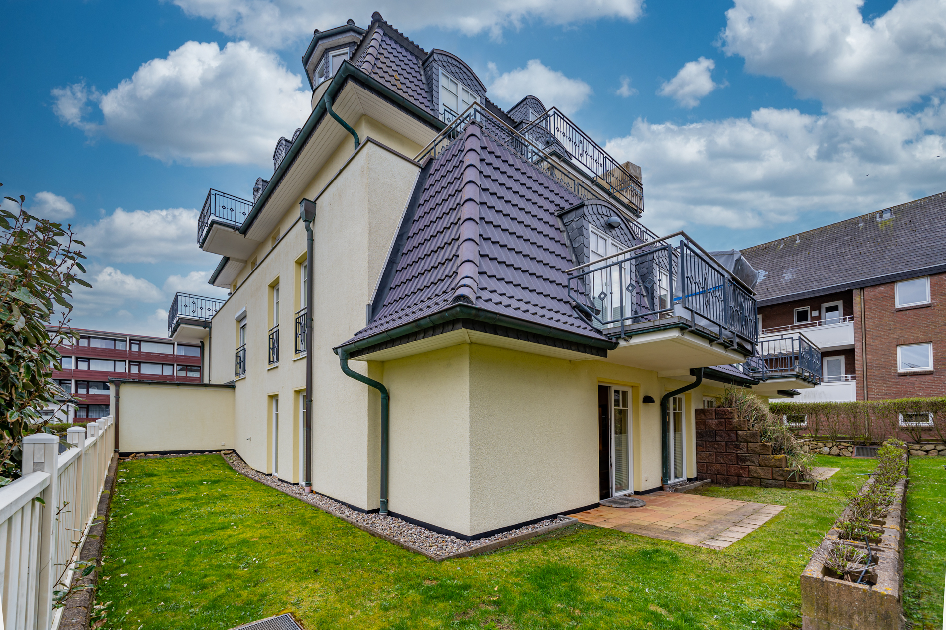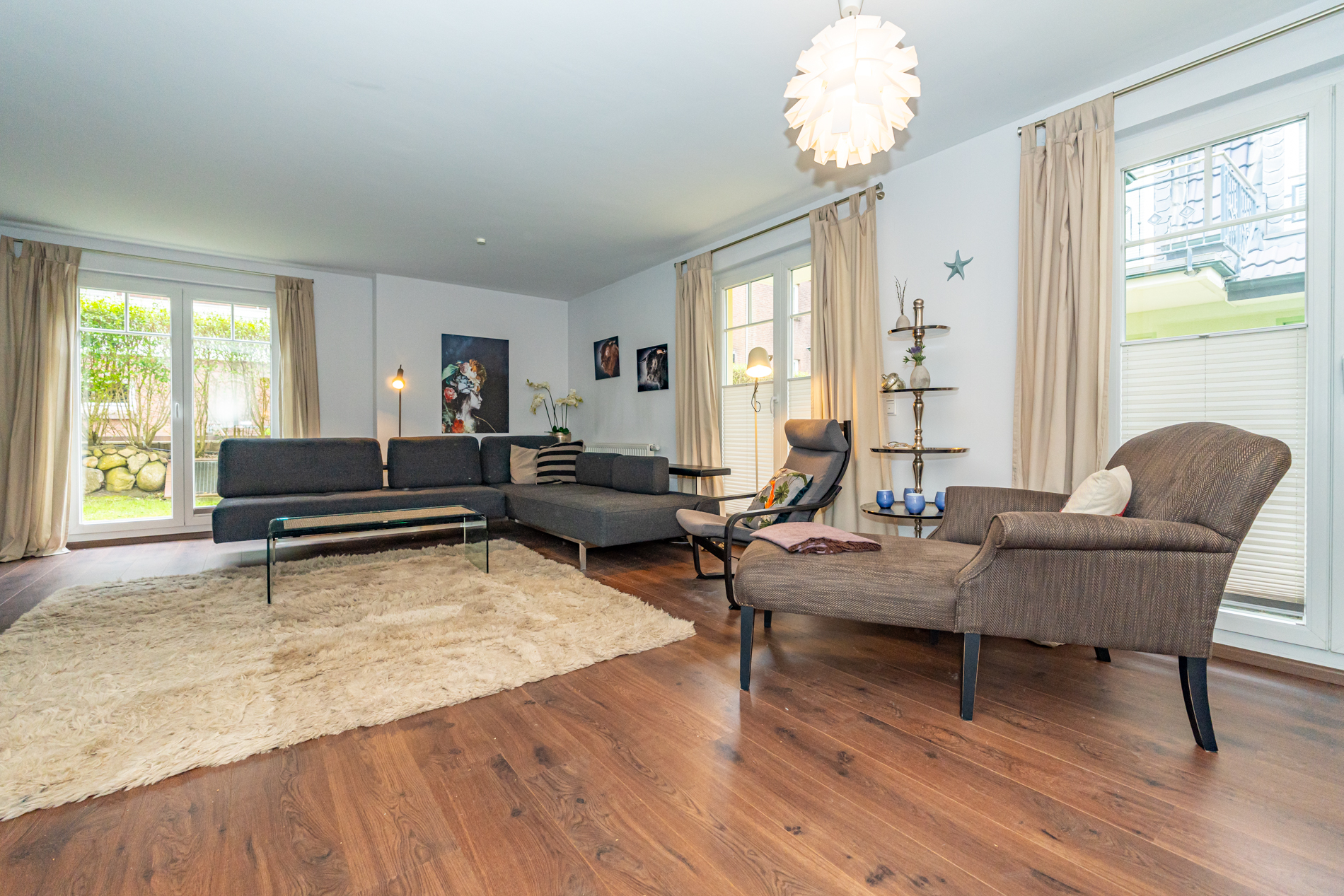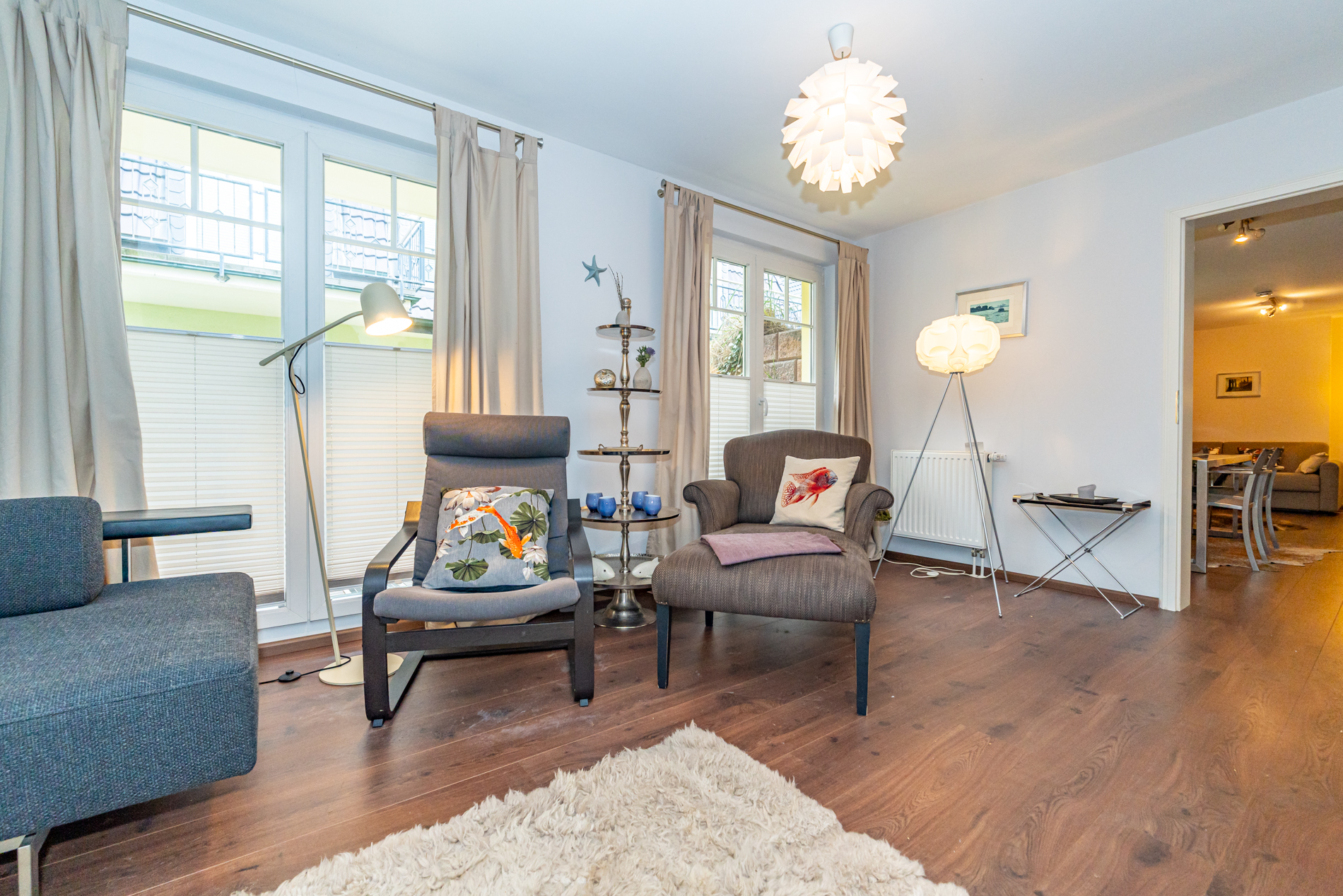 Die 5-Zimmer-Ferienwohnung befindet sich im Erdgeschoss des Hauses Elaine und bietet Platz für bis zu 6 Personen. Sie erstreckt sich auf einer Ebene und verfügt über eine Gesamtfläche von ca. 100 m². Zur Ausstattung gehören 2 Bäder und 2 Terrassen, die Richtung Westen ausgerichtet sind. Auf der Terrasse können Sie die frische Luft und die Sonne genießen.
