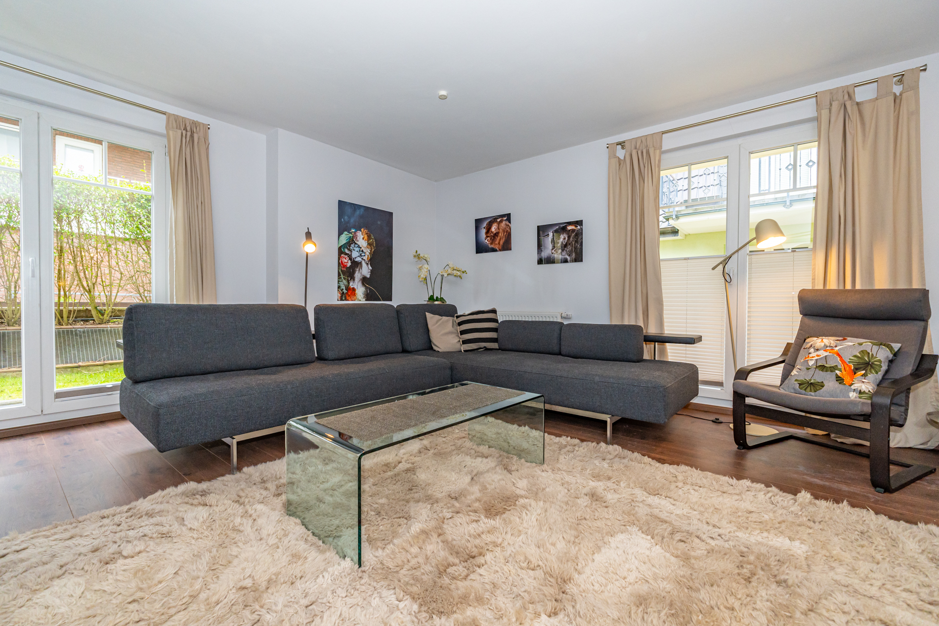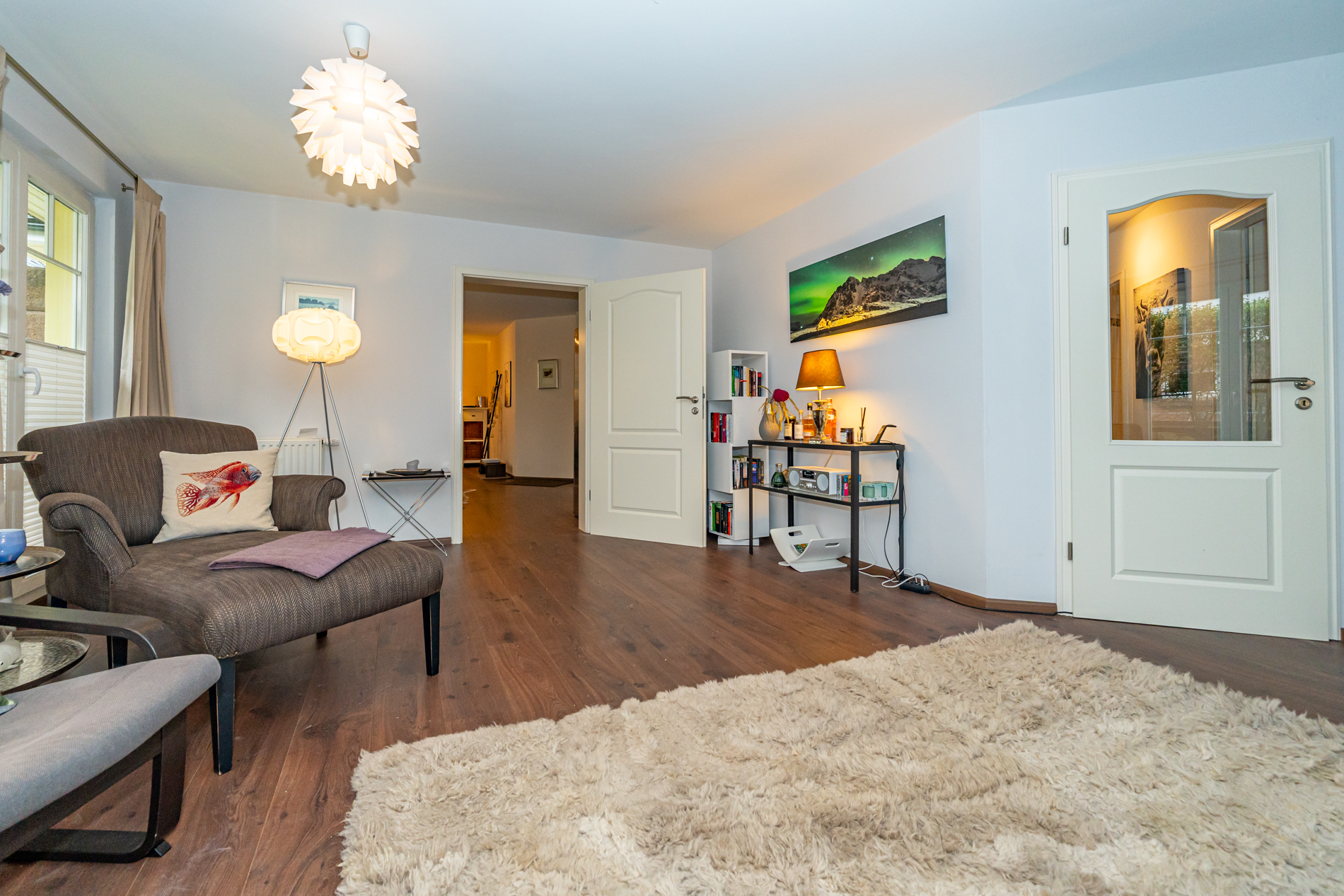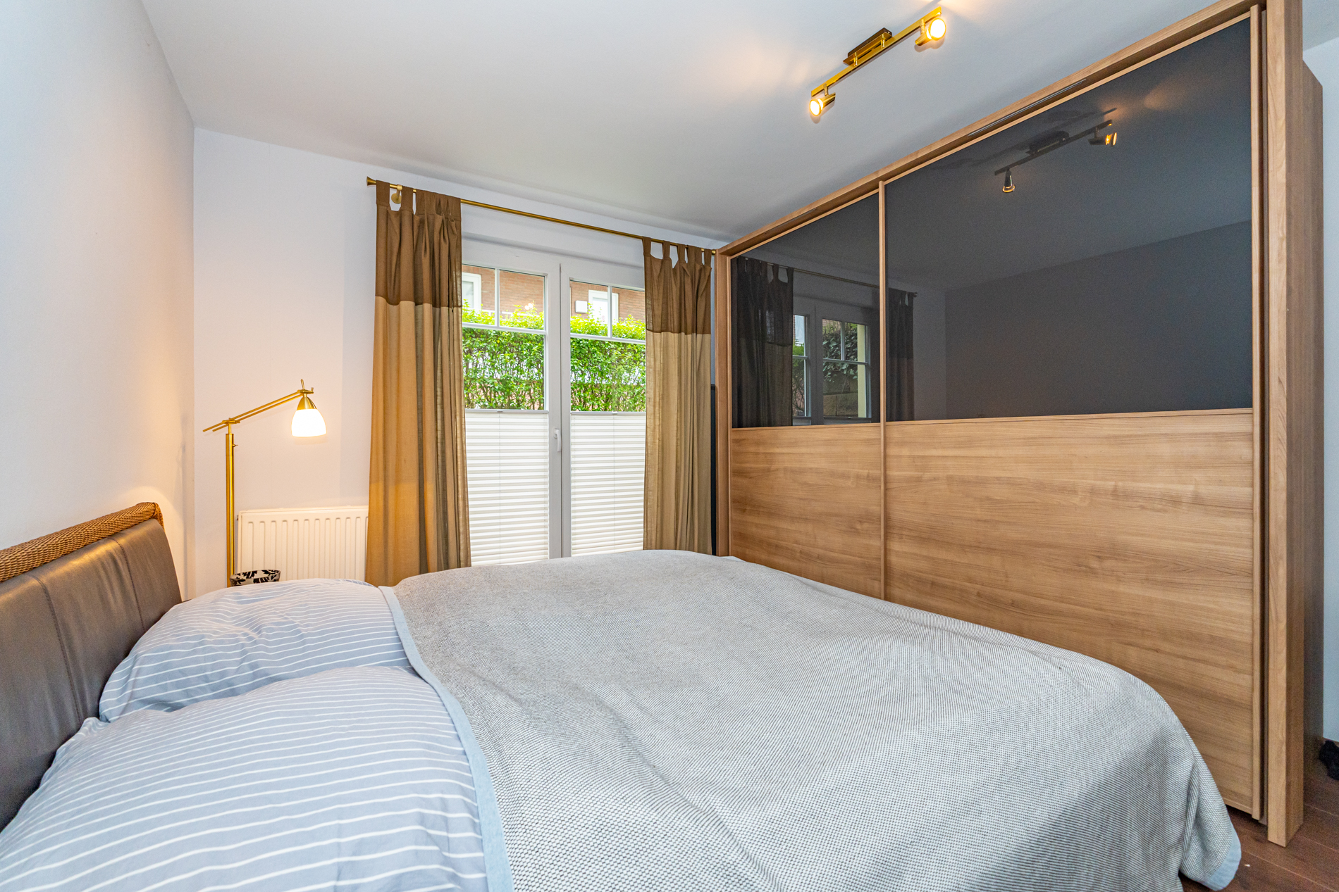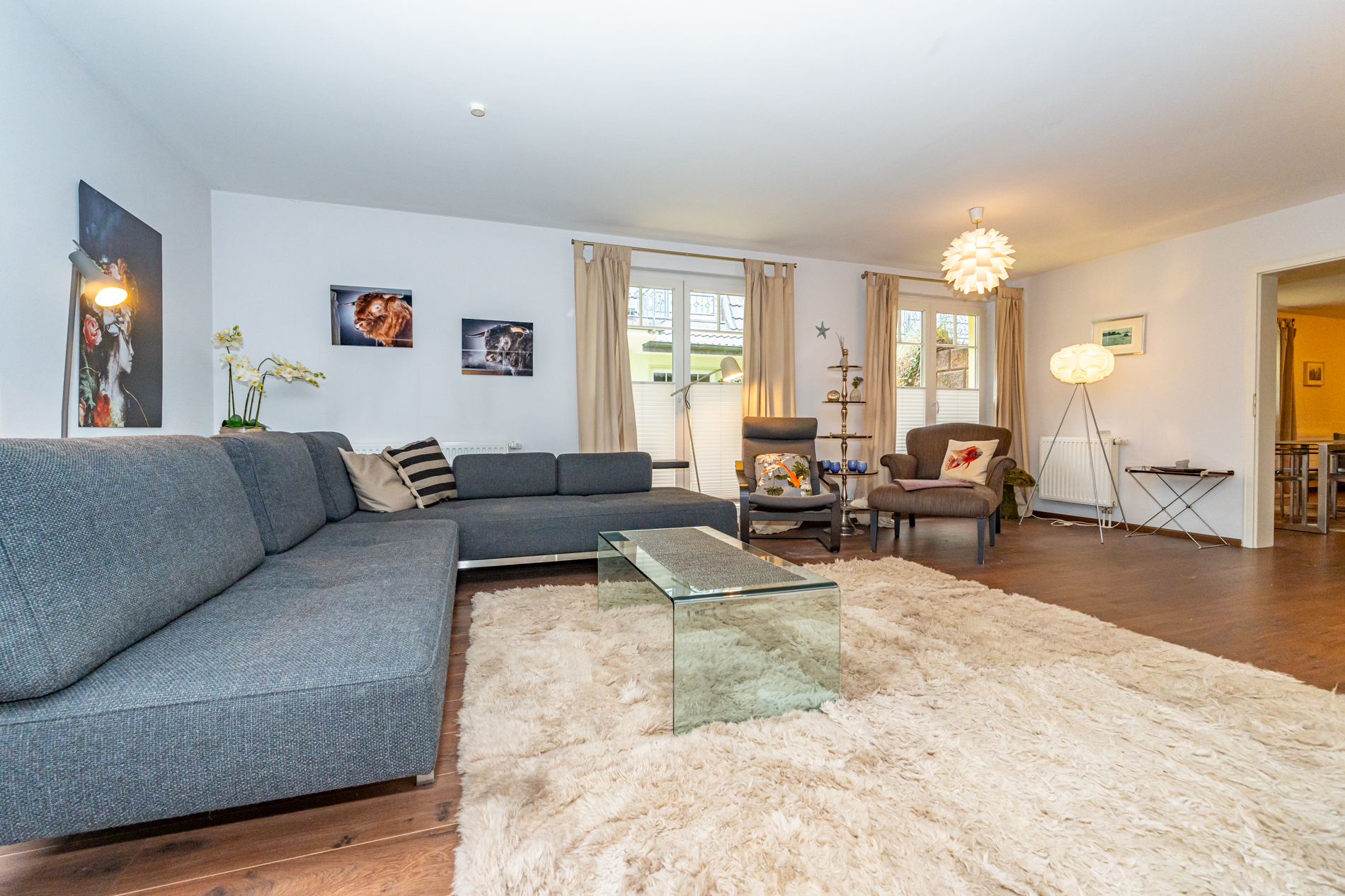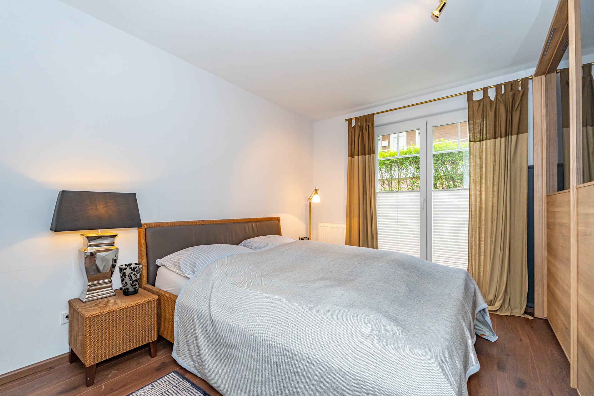 Vom Esszimmer aus gelangt man in das angrenzende gemütliche Wohnzimmer, welches ebenfalls Zugang zu einer Terrasse bietet. Über einen Flur erreicht man ein weiteres Doppel-Schlafzimmer sowie das zweite Badezimmer. In diesem Flur befinden sich zudem ein Abstellraum mit Reinigungsutensilien und zusätzlichem Stauraum.