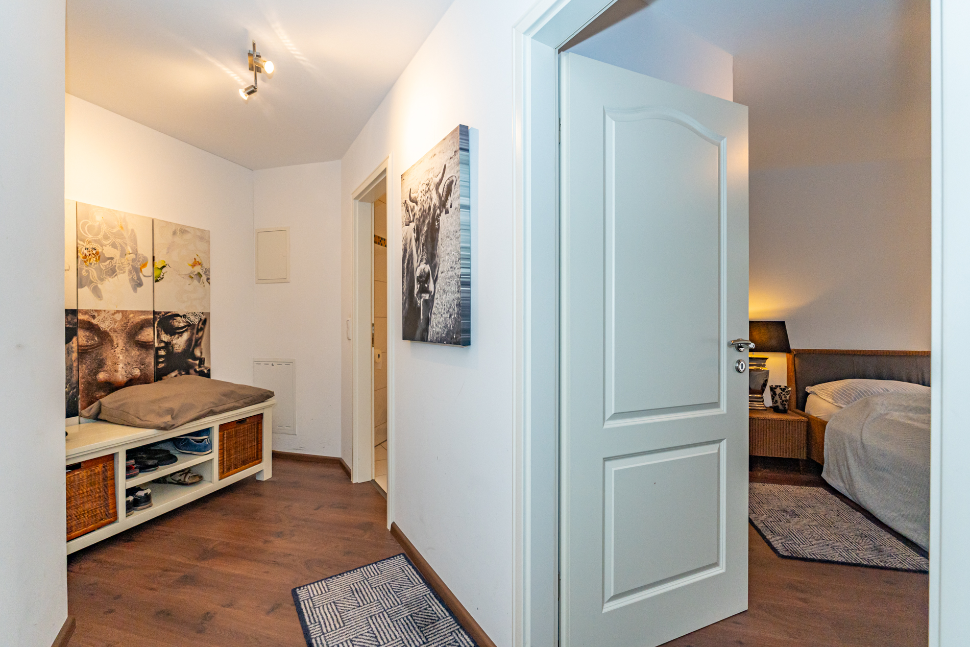 Beim Betreten der Wohnung gelangt man zunächst in die Diele mit Garderobe. Von dort aus gelangt man in das gemütliche Esszimmer sowie ein Schlafzimmer für 2 Personen. Ein weiteres Doppel-Schlafzimmer und das Badezimmer mit Fenster sind ebenfalls von der Diele aus erreichbar.