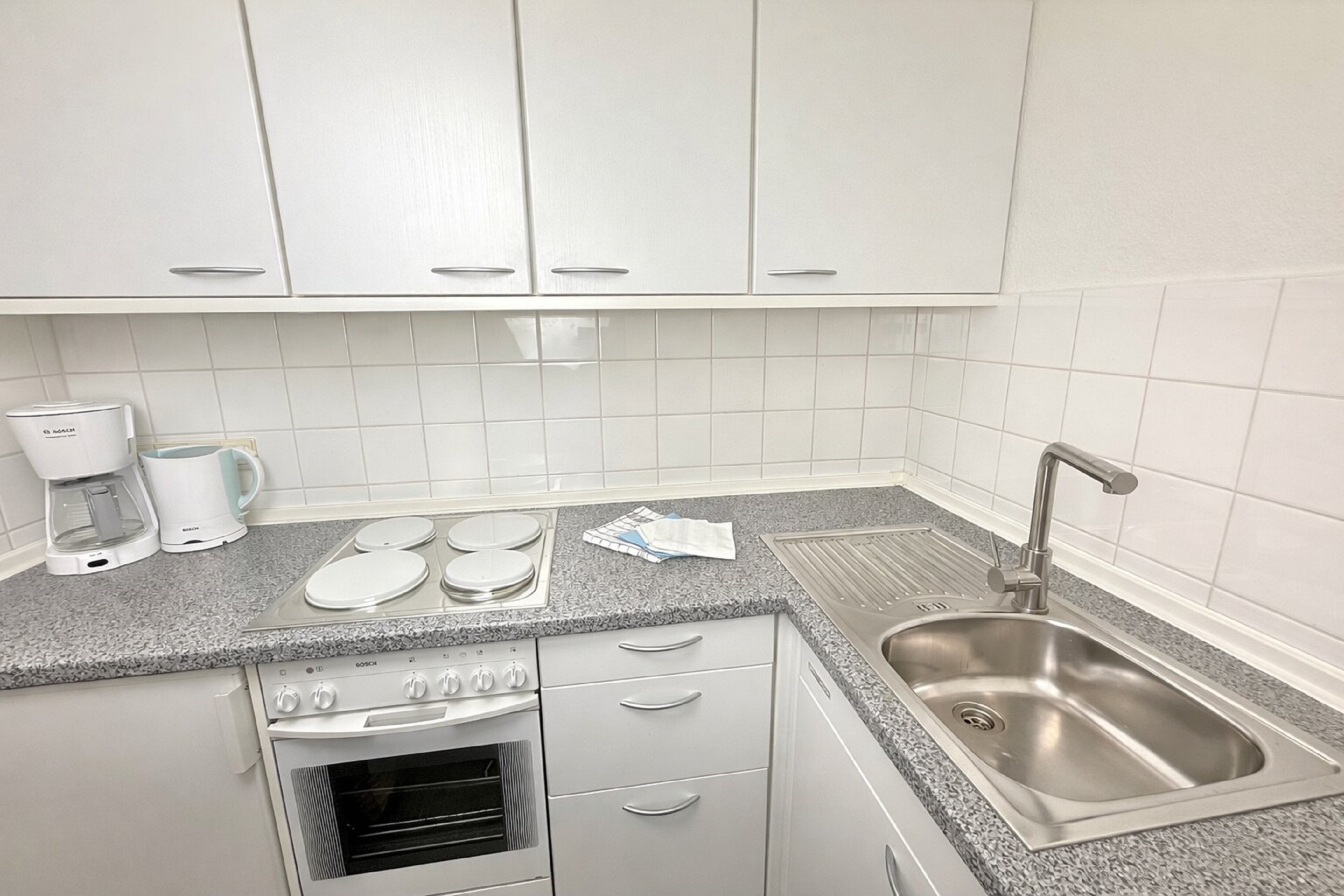 Die zum Wohnraum geöffnete Küche hat einen 4-Plattenherd mit Backofen. Kaffeemaschine, Wasserkocher und Toaster gehören zur Grundausstattung.