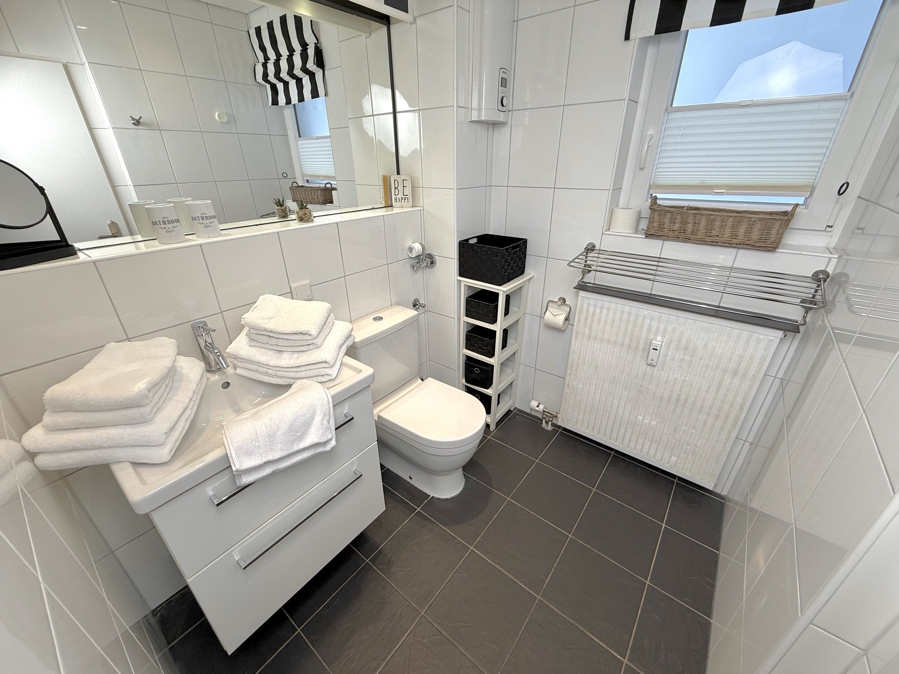 Das moderne und neue Duschbad/WC mit Fenster ist perfekt für einen Start in einen entspannten Urlaubstag.