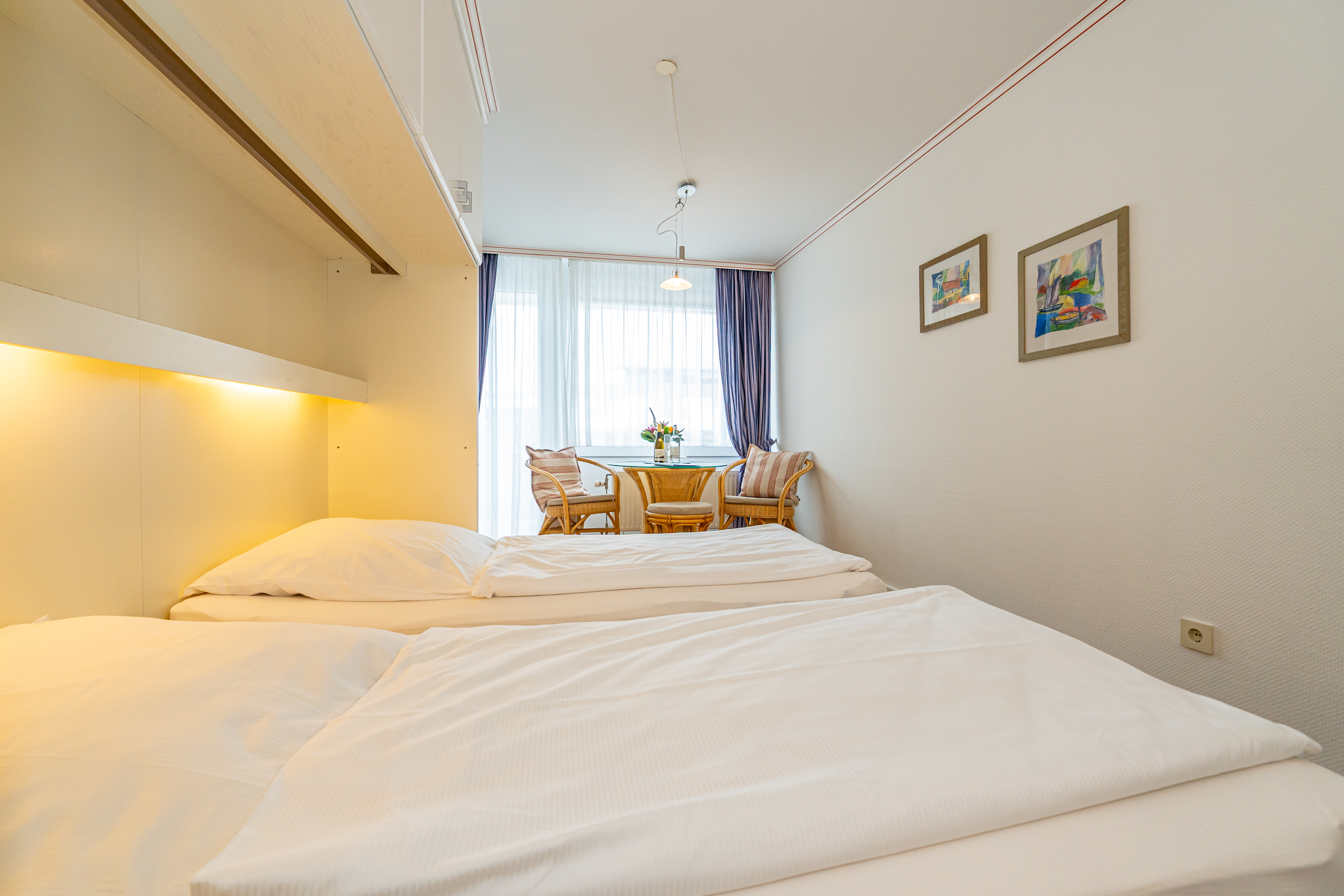 Der Wohn-/Schlafraum besteht aus drei Rattan-Sessel, einem separatem Essplatz, Doppelschrankbett (Betten sind einzeln ausklappbar, spezielle Matratzen für Allergiker, Größe: 1,00 m x 2,00 m), Kabel-Flachbild-TV, Radio/CD.