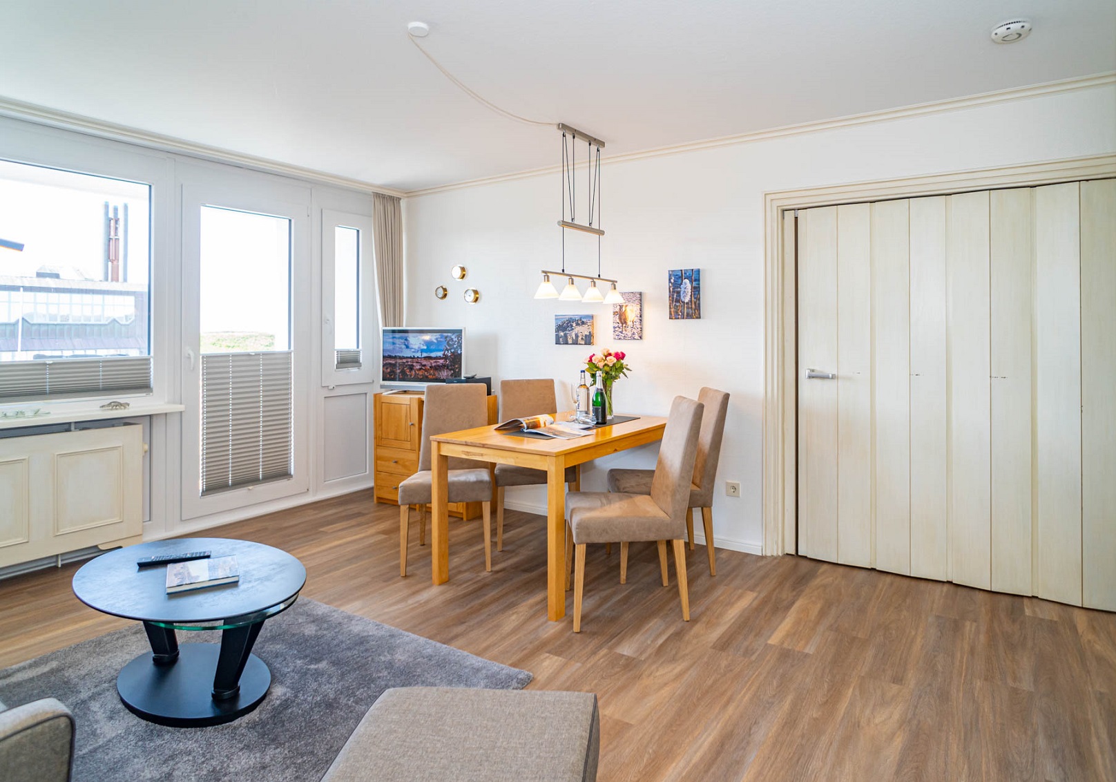 Der Wohnraum besteht aus einer gemütlichen Sitzgarnitur (Zweisitzer und 2 Sessel), einem Essplatz,  Flachbild-TV, DVD.